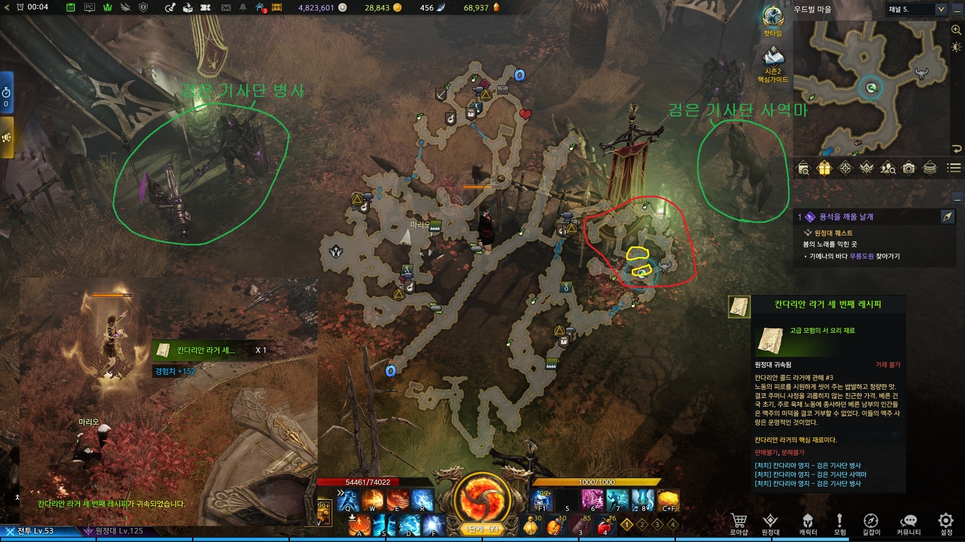 빨간마킹 전역에서 젠되나 노란마킹 부분이 좁은 범위에 몬스터가 많아 나와 파밍장소로 추천