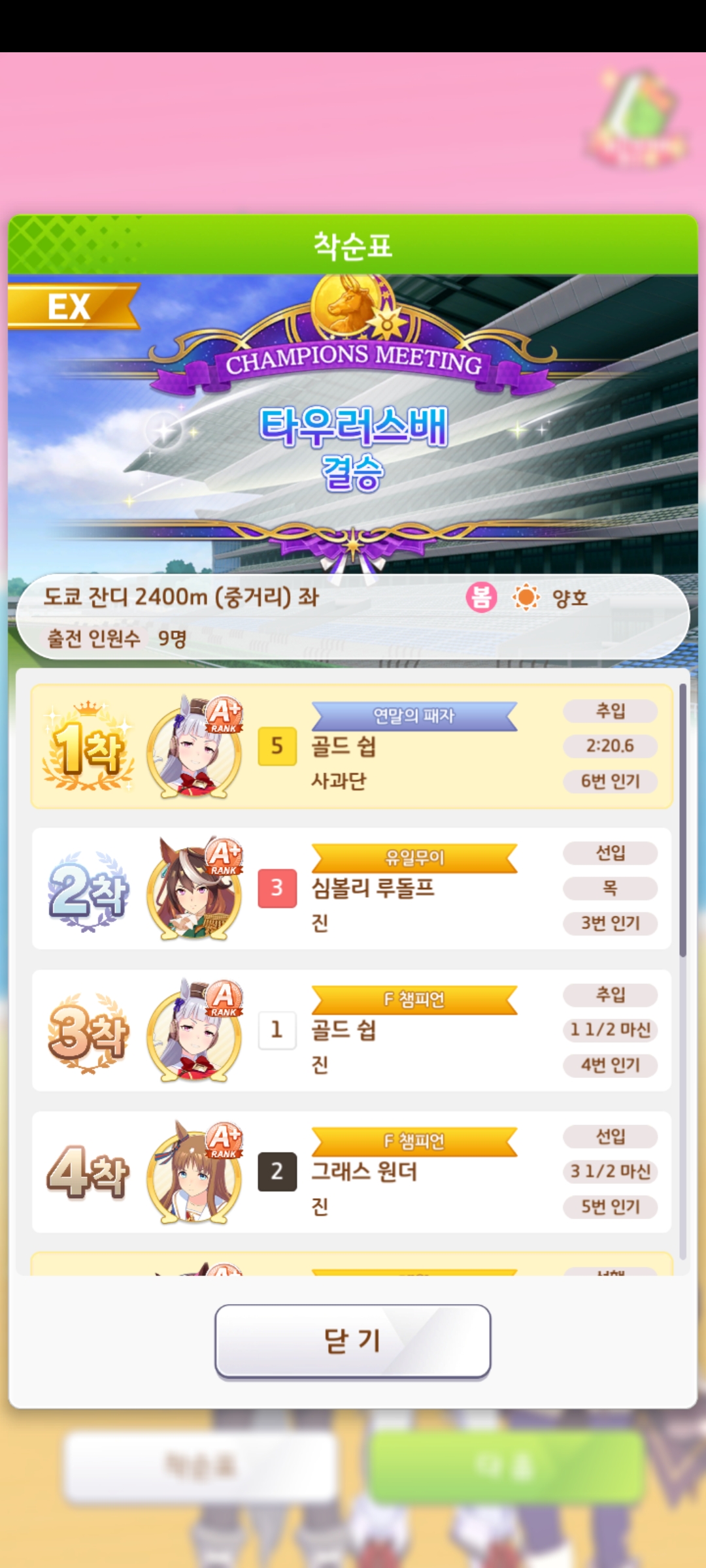| 우마무스메 프리티 더비 챔피언스 미팅 2회차 제미니배 우승 (0) | 2023.10.09 |