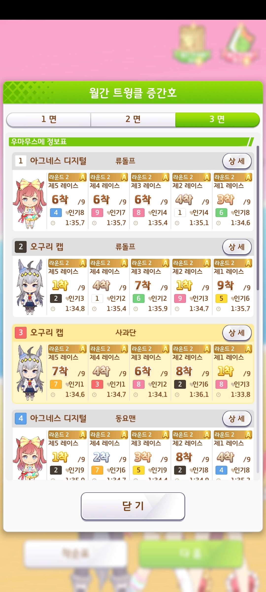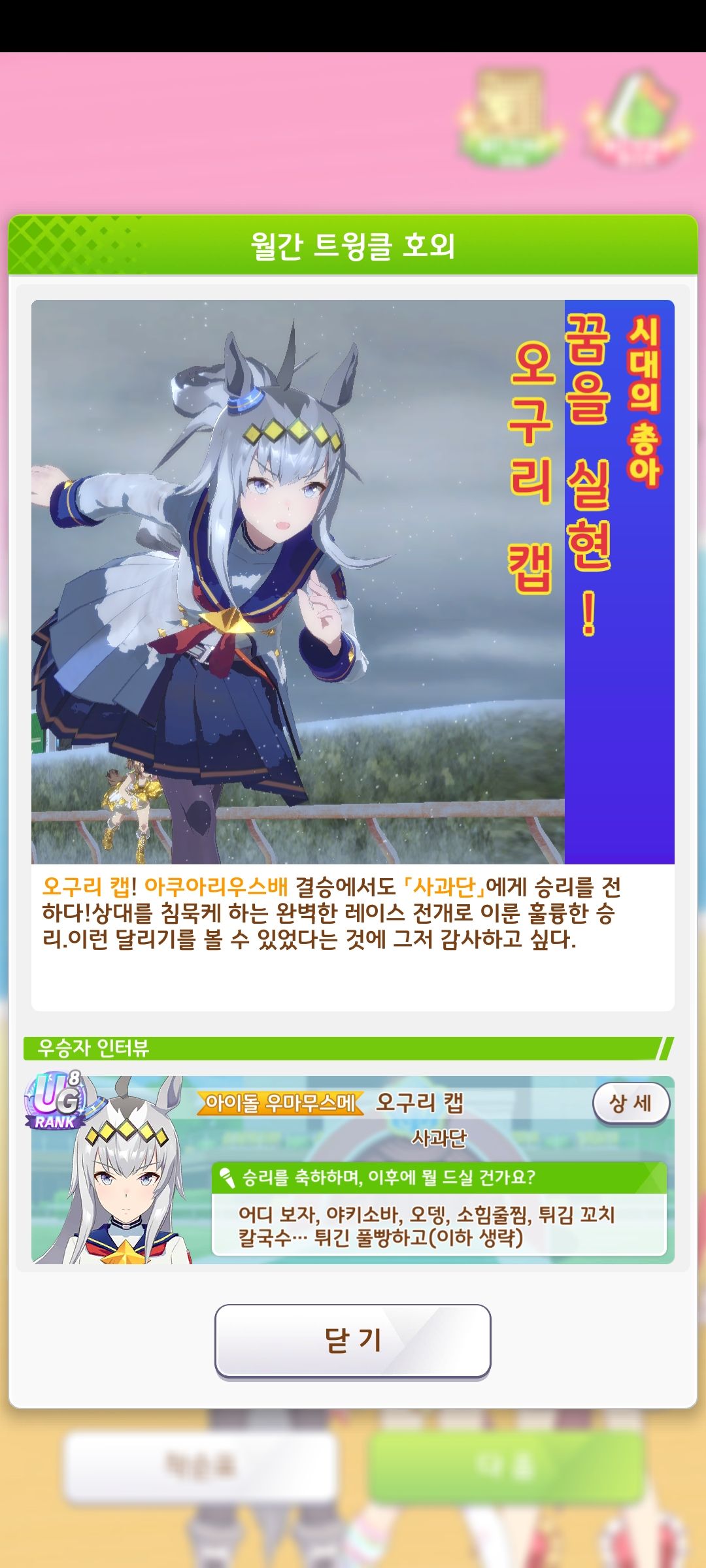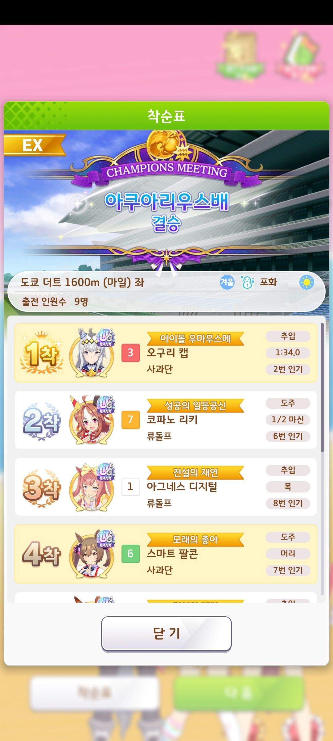 | 우마무스메 프리티 더비 챔피언스 미팅 2회차 제미니배 우승 (0) | 2023.10.09 |