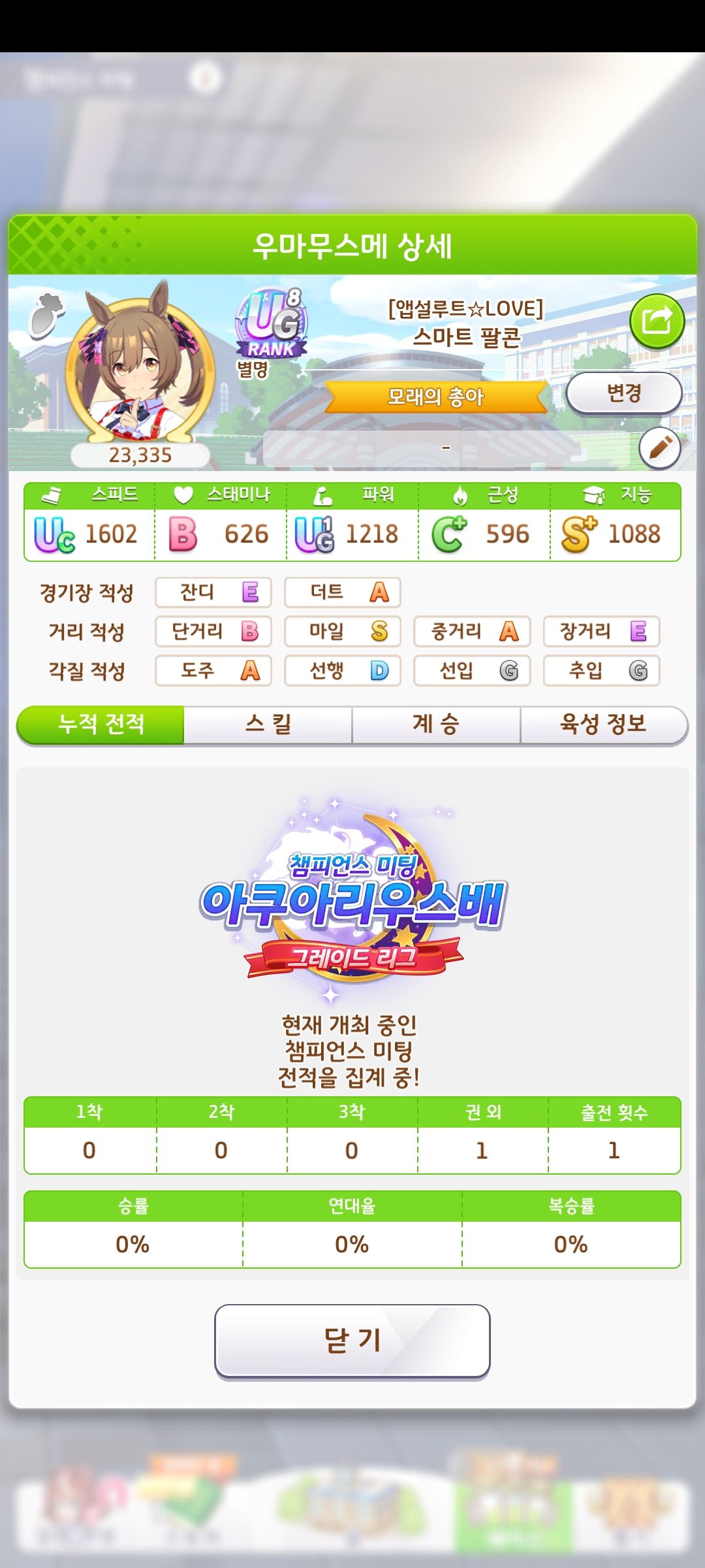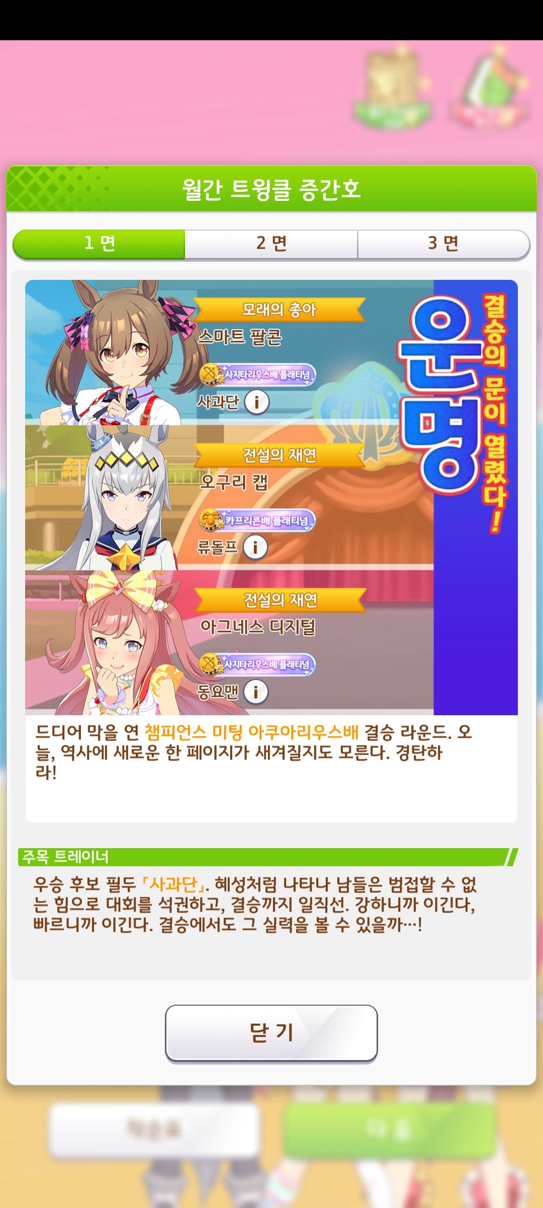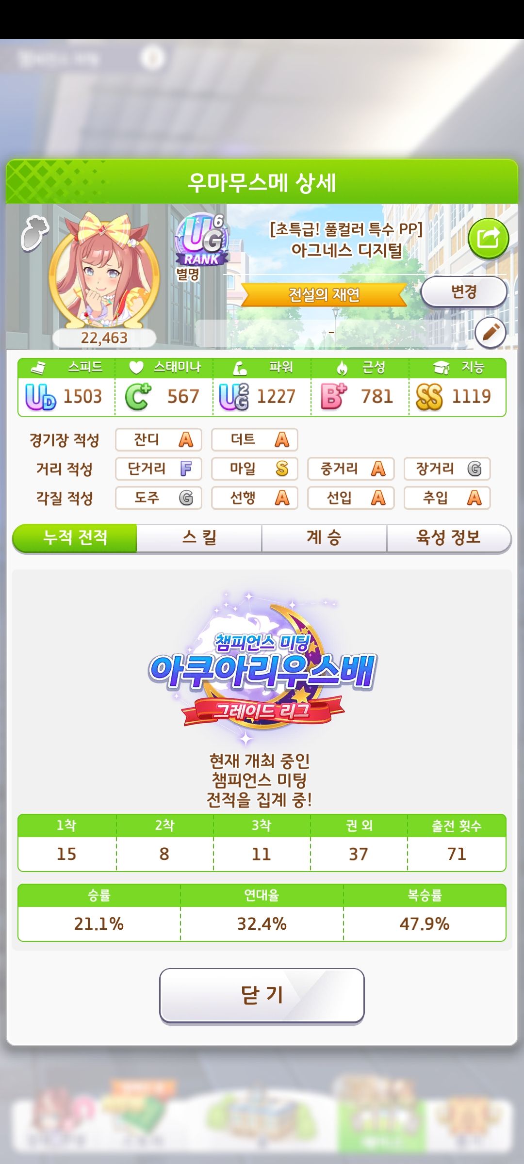 | 우마무스메 프리티 더비 챔피언스 미팅 2회차 제미니배 우승 (0) | 2023.10.09 |