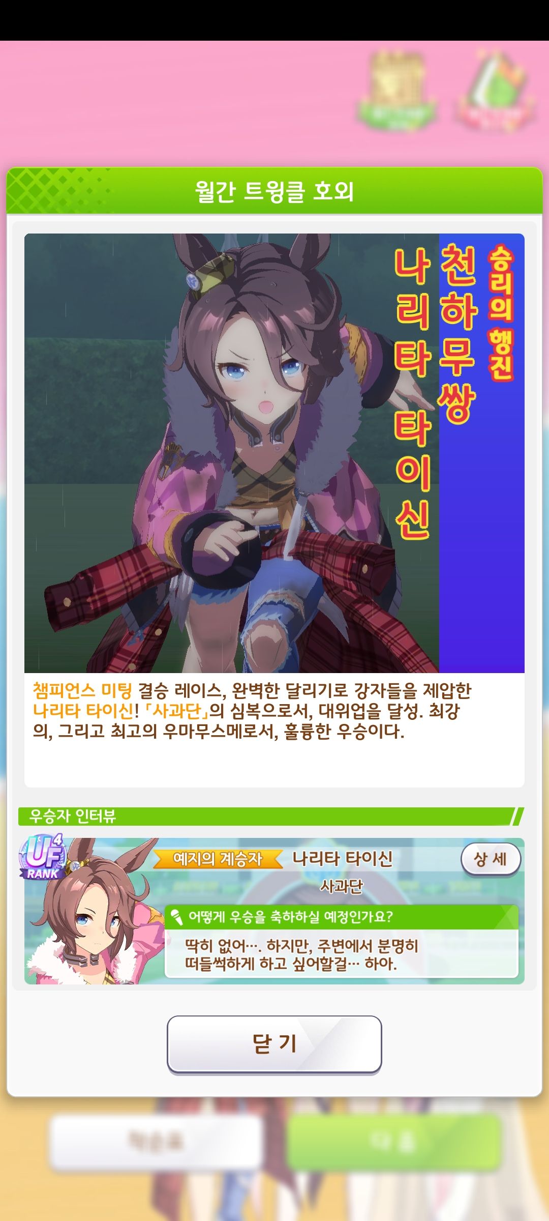 | 우마무스메 프리티 더비 챔피언스 미팅 2회차 사지타리우스배 우승 (0) | 2024.04.09 |