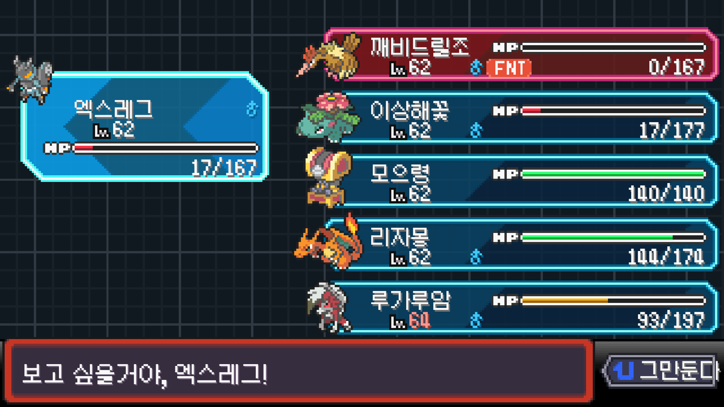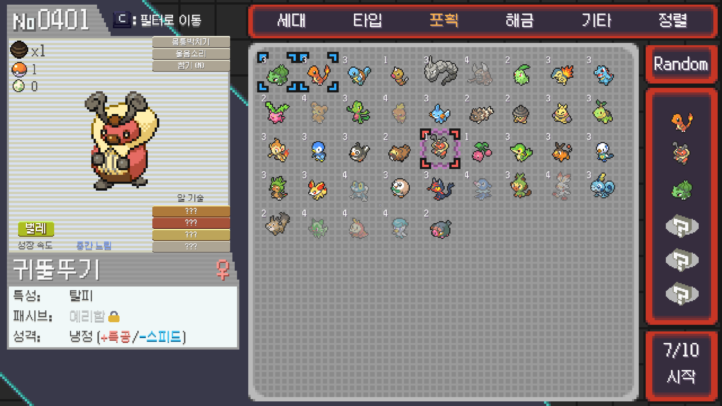 스타팅은 근본의 파이리 + 이상해씨에 경험치 셔틀 용 감염된 귀뚤뚜기