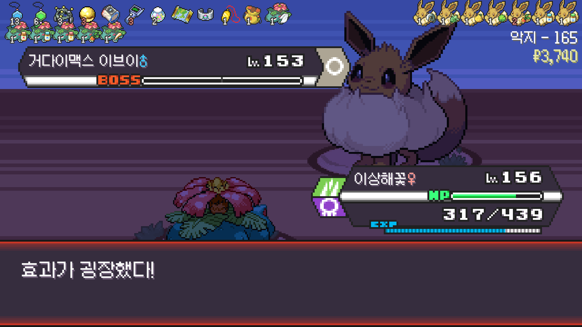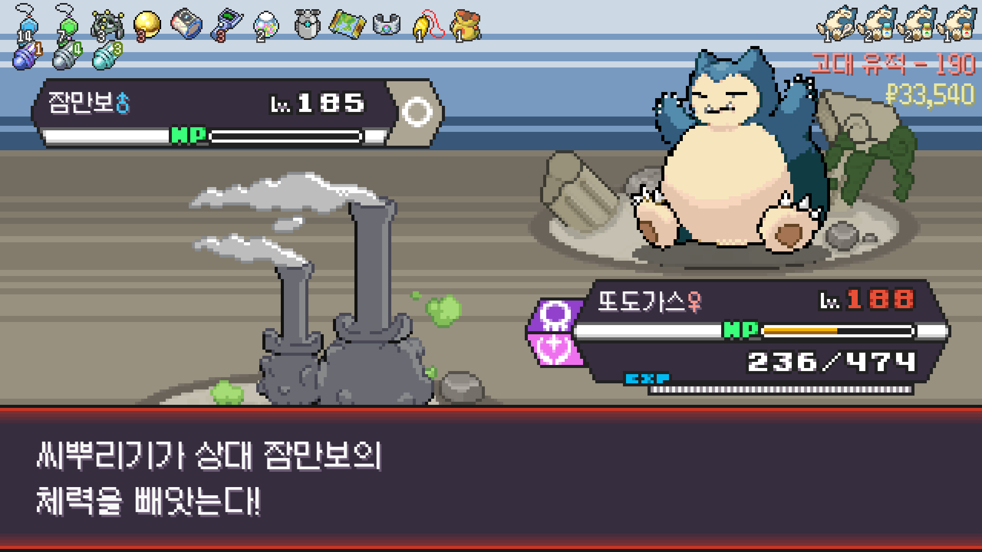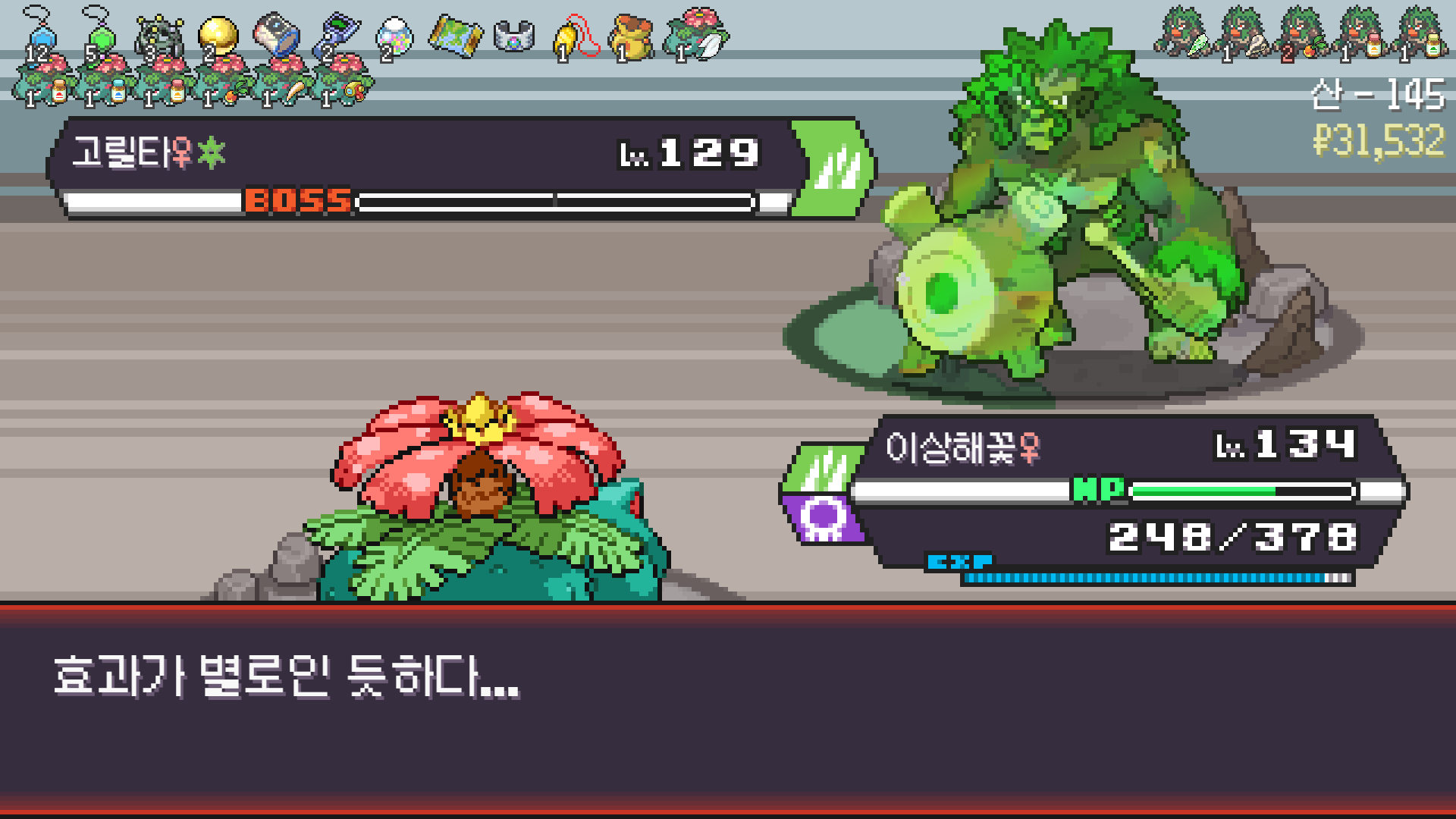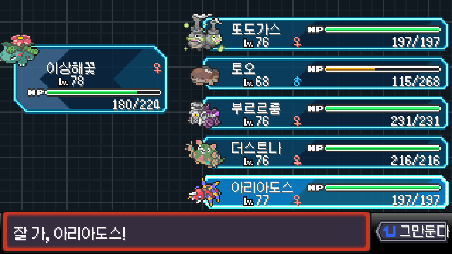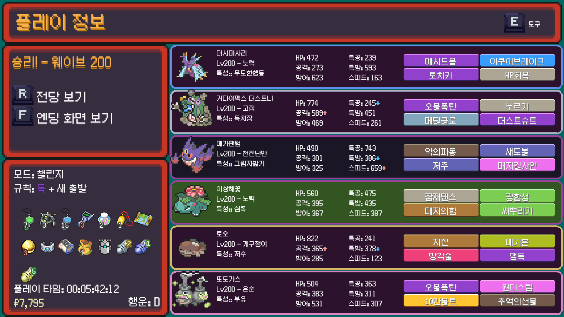 패배의 경험을 토대로 체감 구렸던 부르르룸은 팬텀나왔을때 바로 유기시키고 메가진화 못시키니 쓸모없는 독침붕대신 든든한 탱커라인들 추가하니 돈 관리도 잘되서 버프도 다 찾는등 선순환이 계속 이어져서 무난하게 클리어했다.
