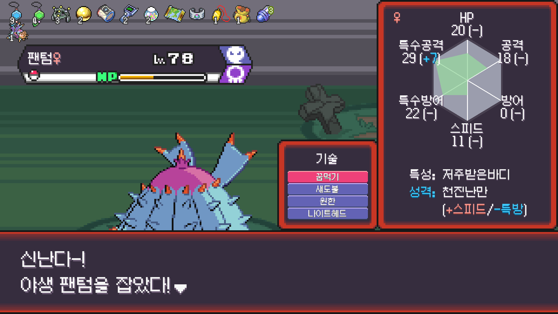 1페는 토오 망각술로 특방 펌핑 후 또도가스랑 메가팬텀으로 패서 넘기고 2페에 저주발라서 무난하게 클리어