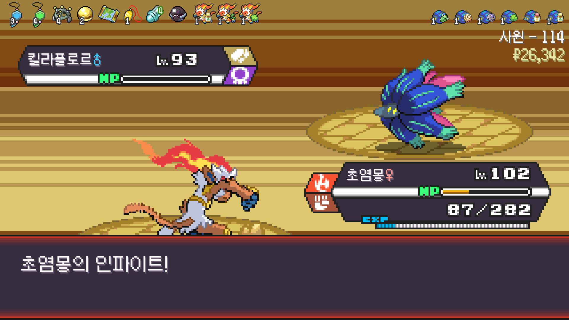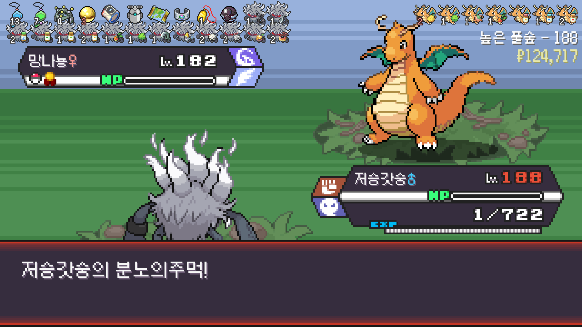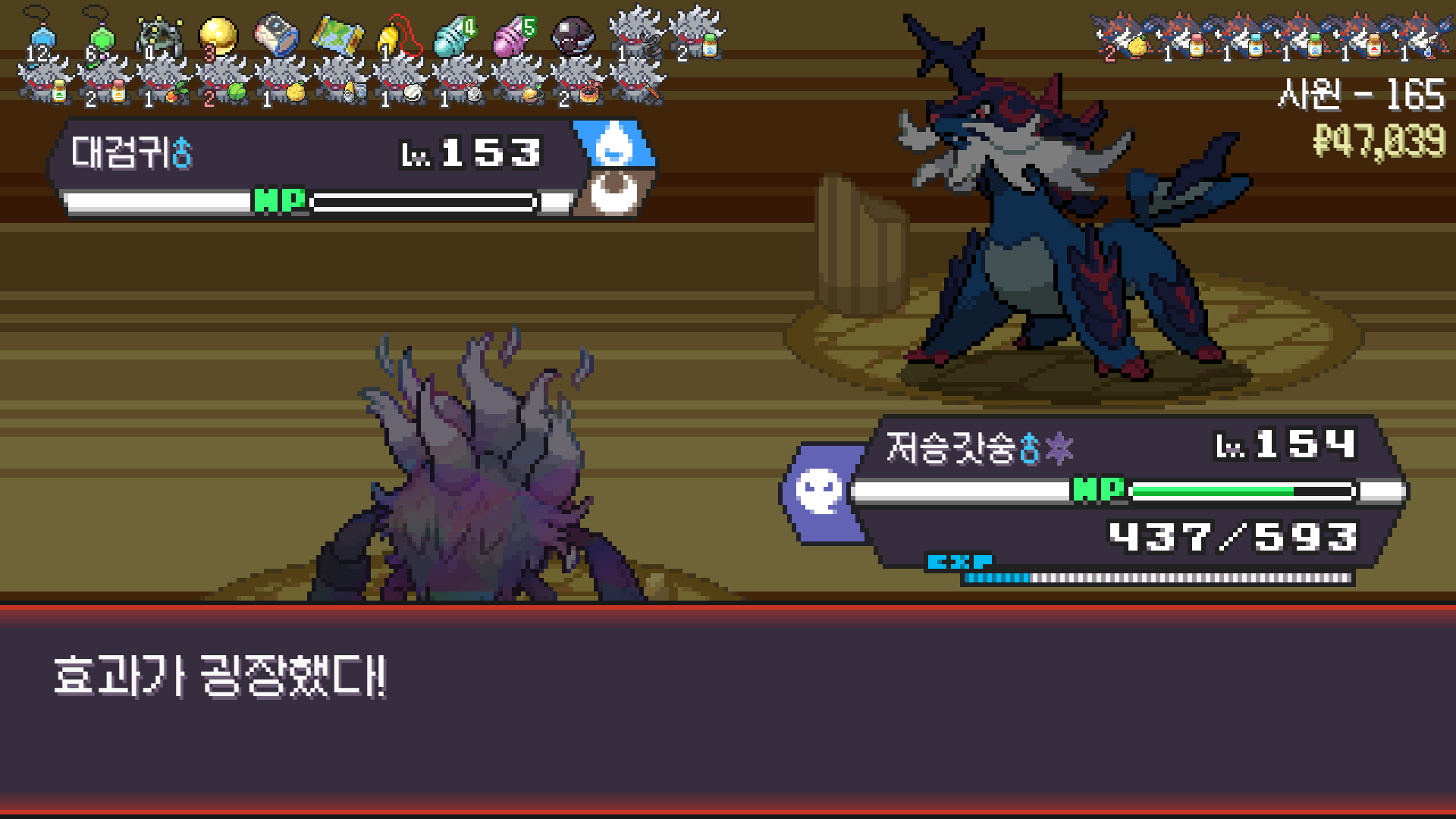 스페이스 광클하다 실수로 벌크업 한 번 더 썼는데 기합의띠 터져서 정리된 드래곤 사천왕