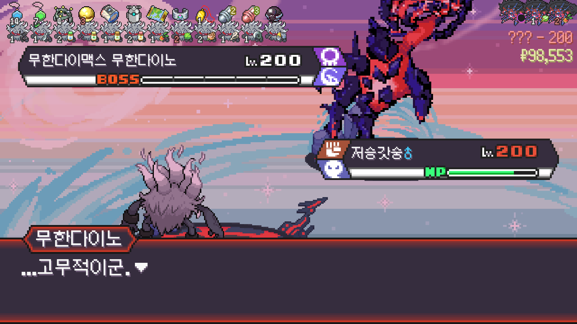 무한다이노 피통 1.5칸일때 저승갓승으로 배턴터치하며 1페 종료