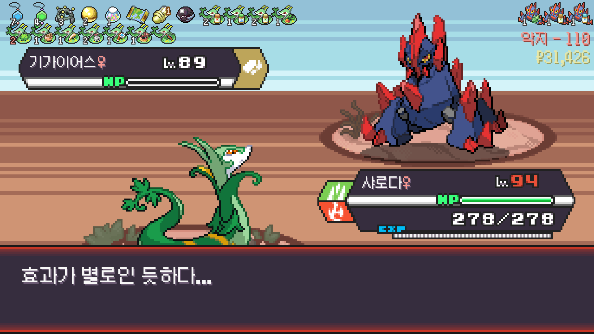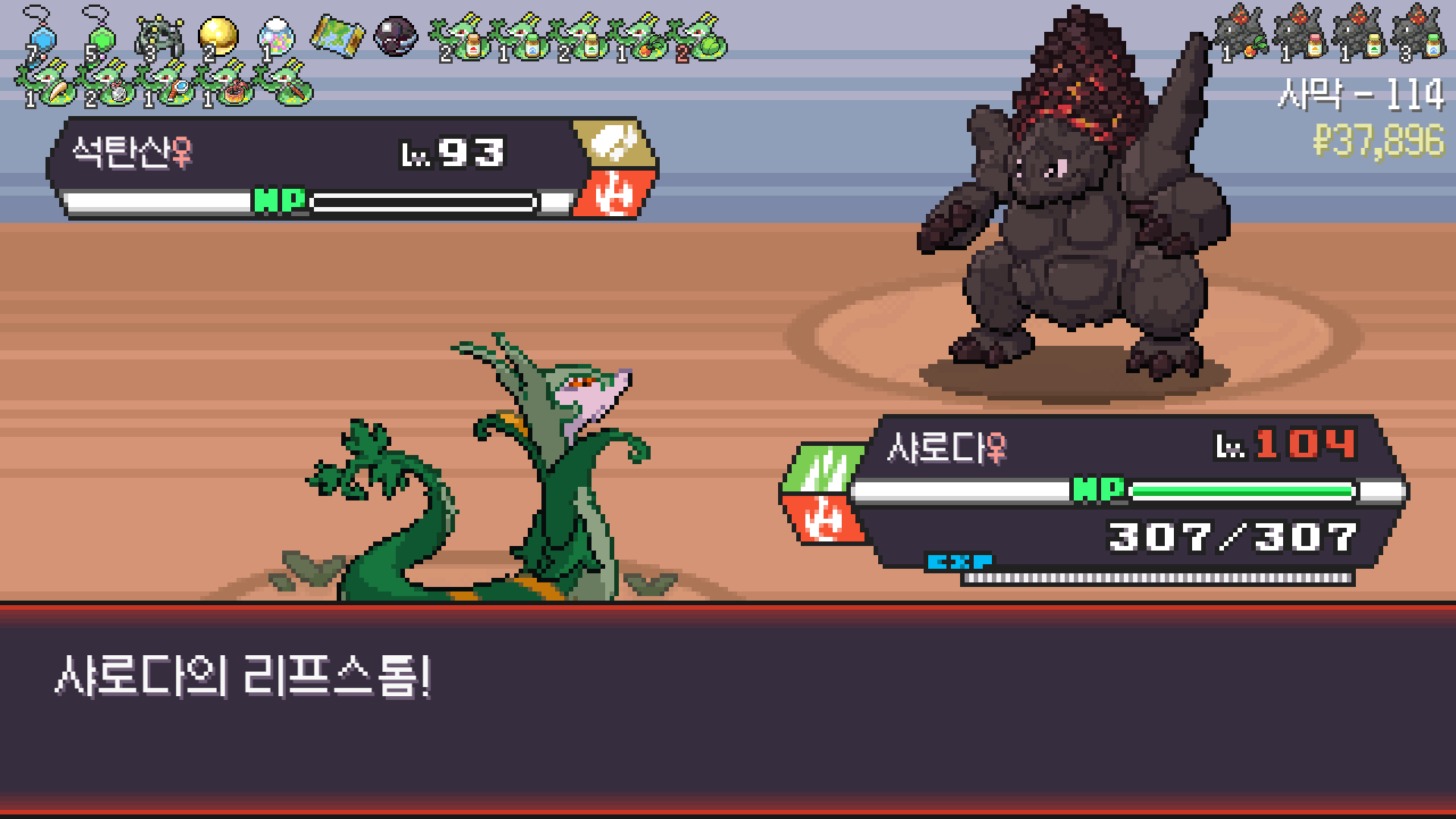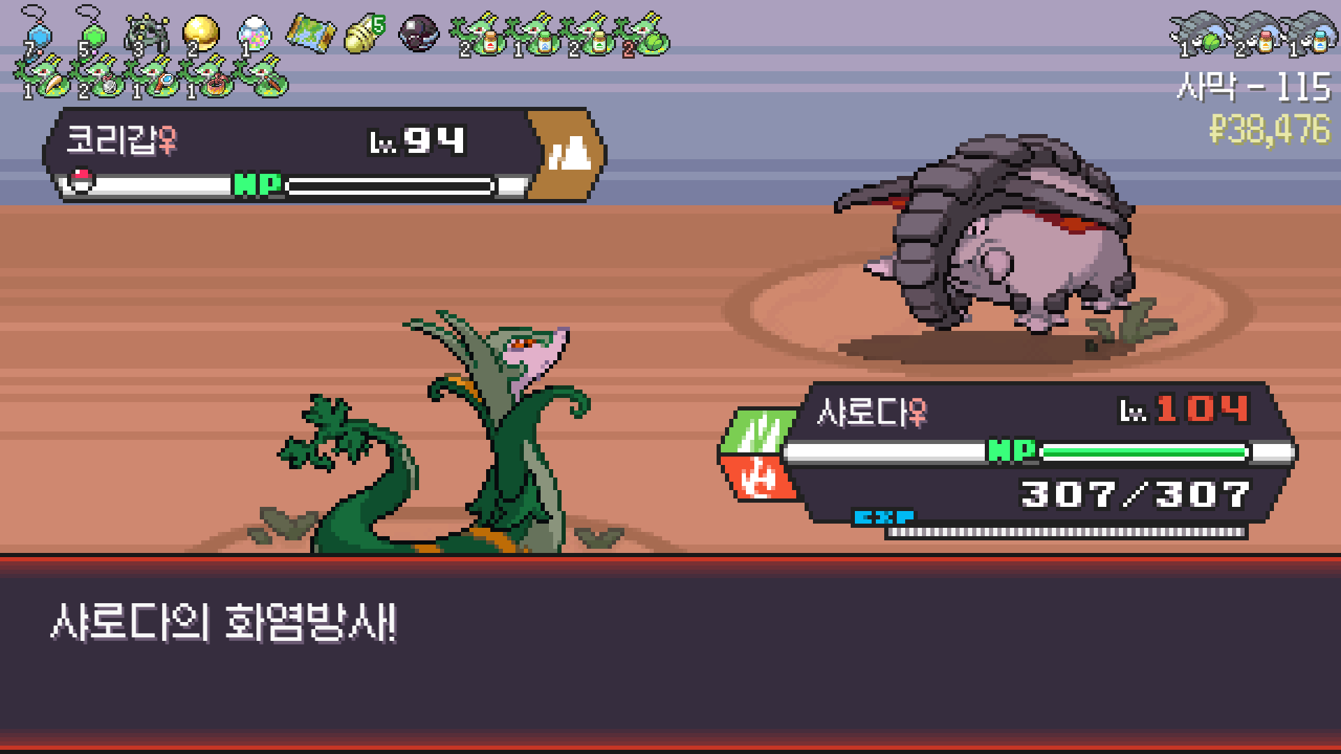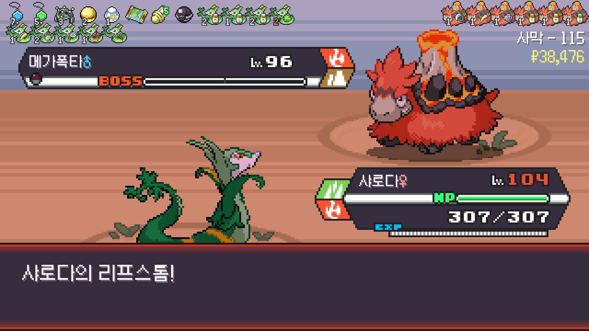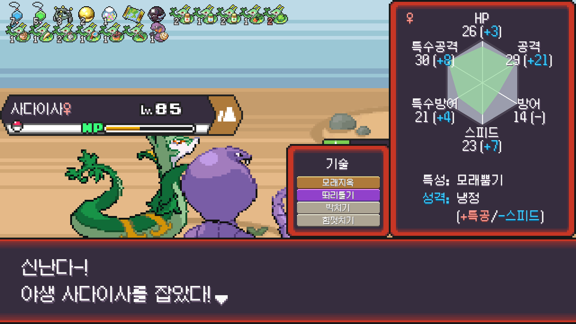 사다이사의 작아지기 3번 후 모래뿜기 + 엄습하는일격으로 1페 넘기고