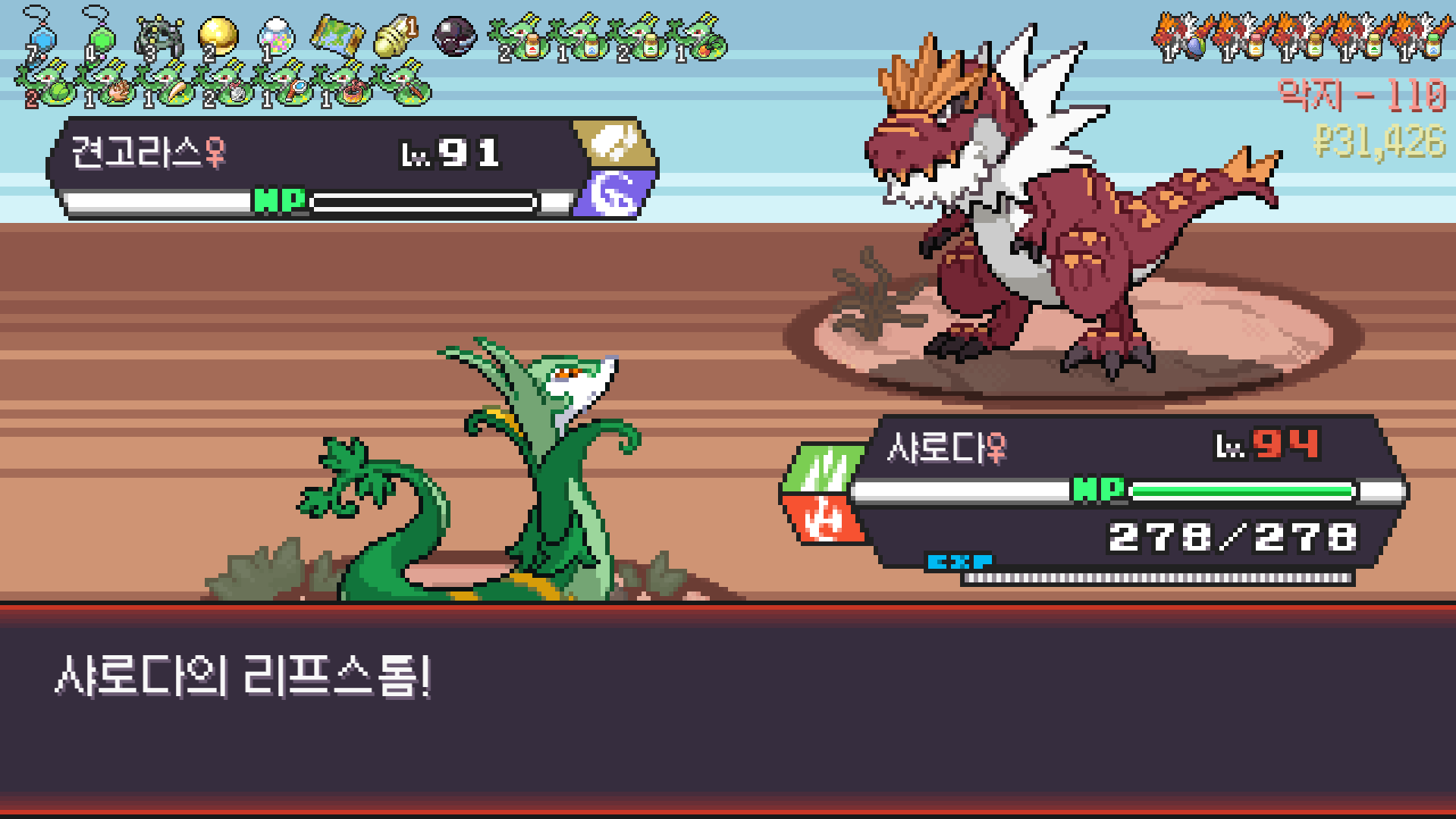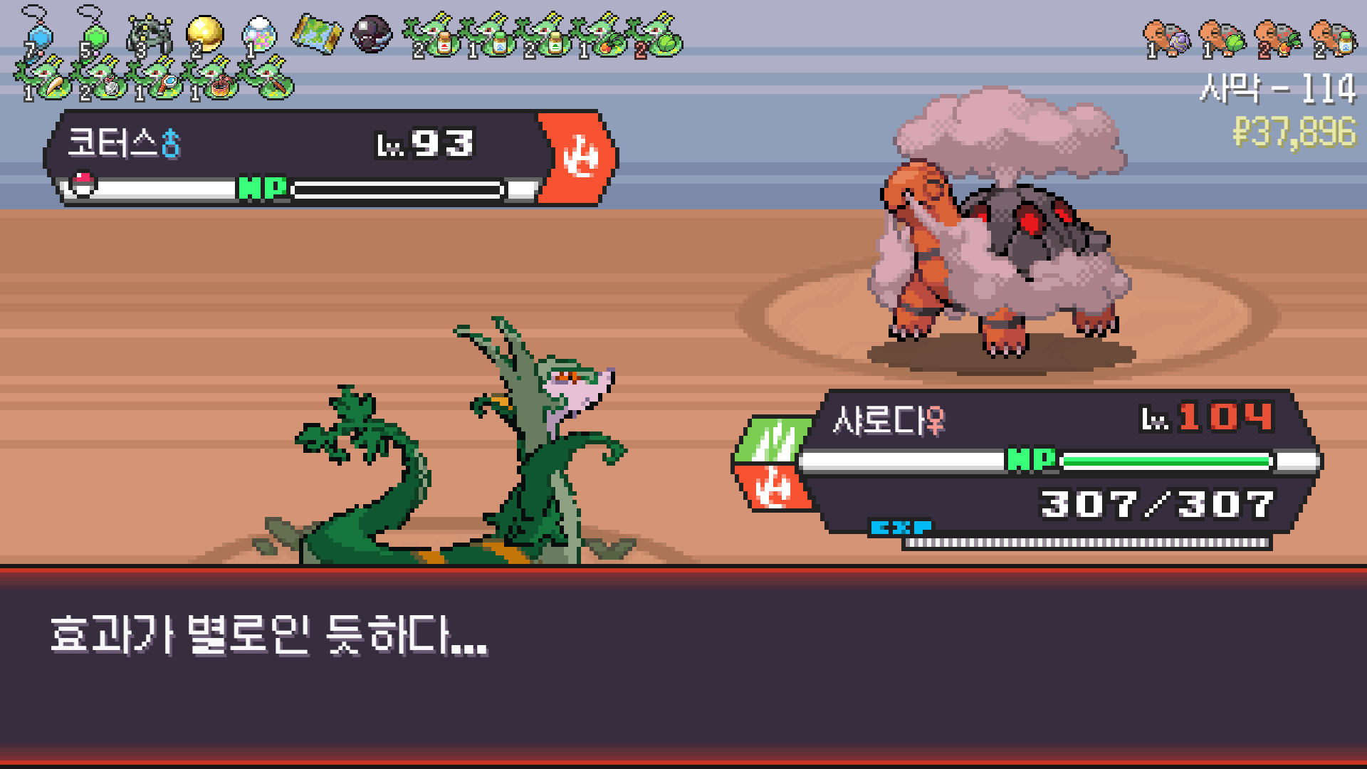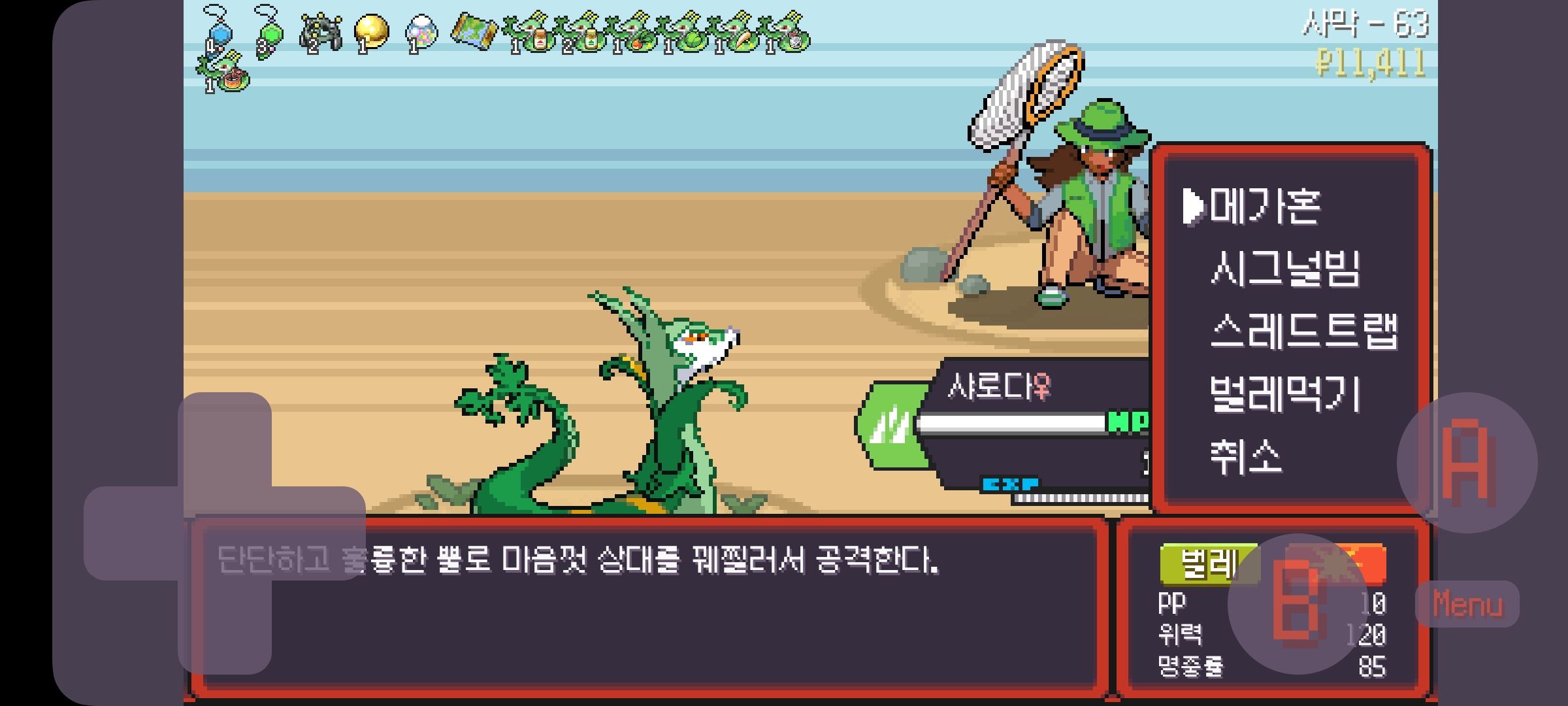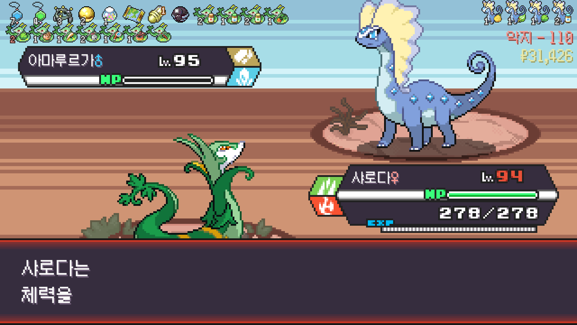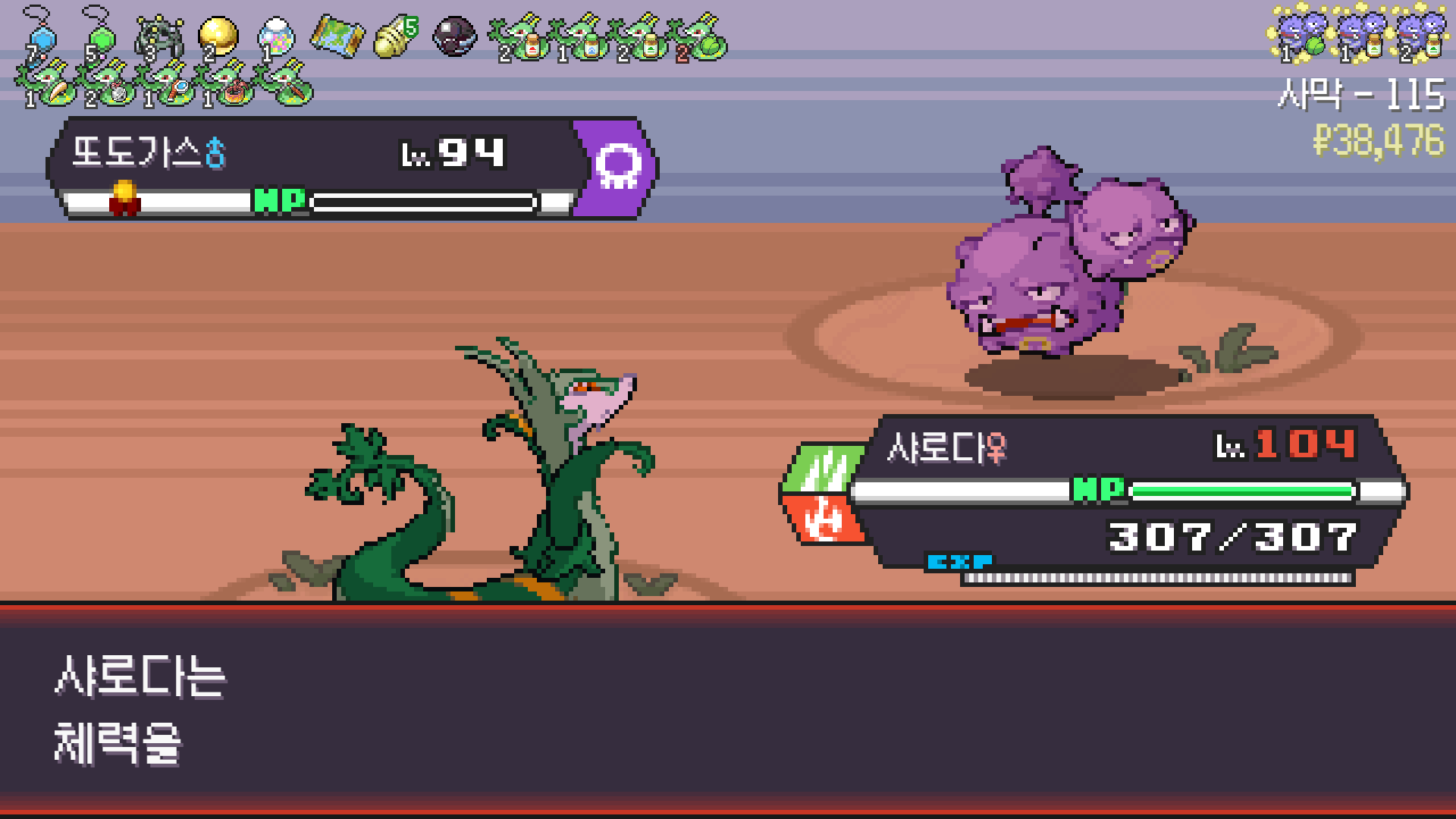 사다이사의 작아지기 3번 후 모래뿜기 + 엄습하는일격으로 1페 넘기고