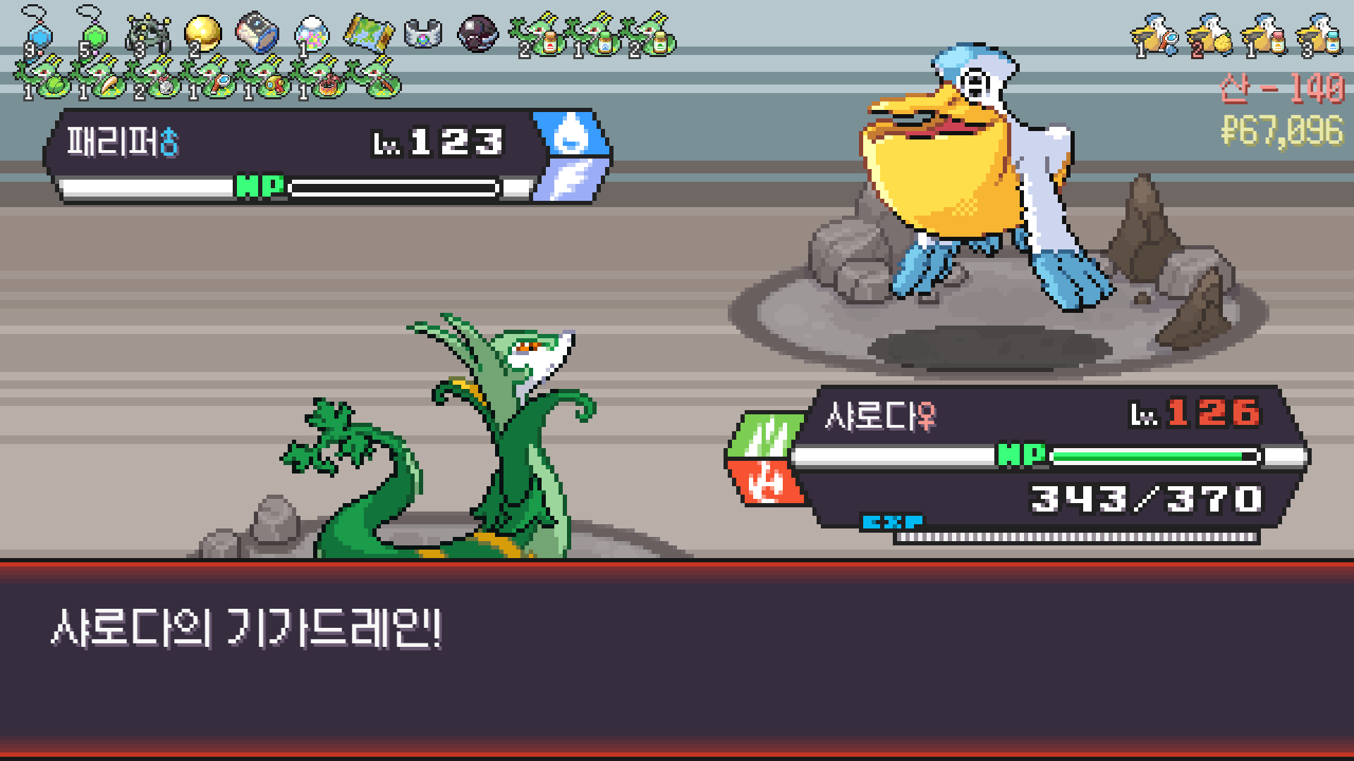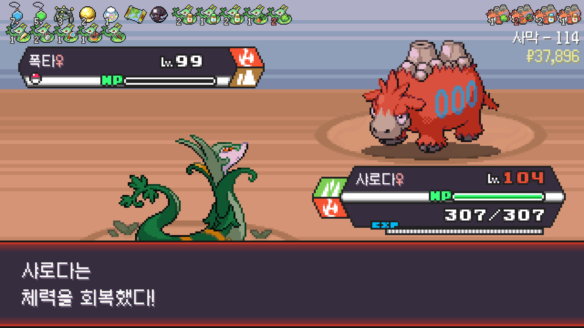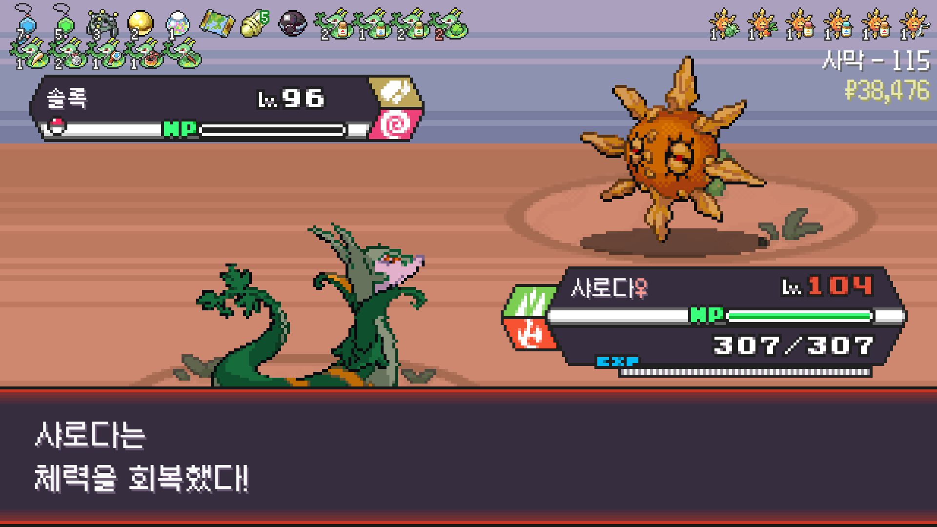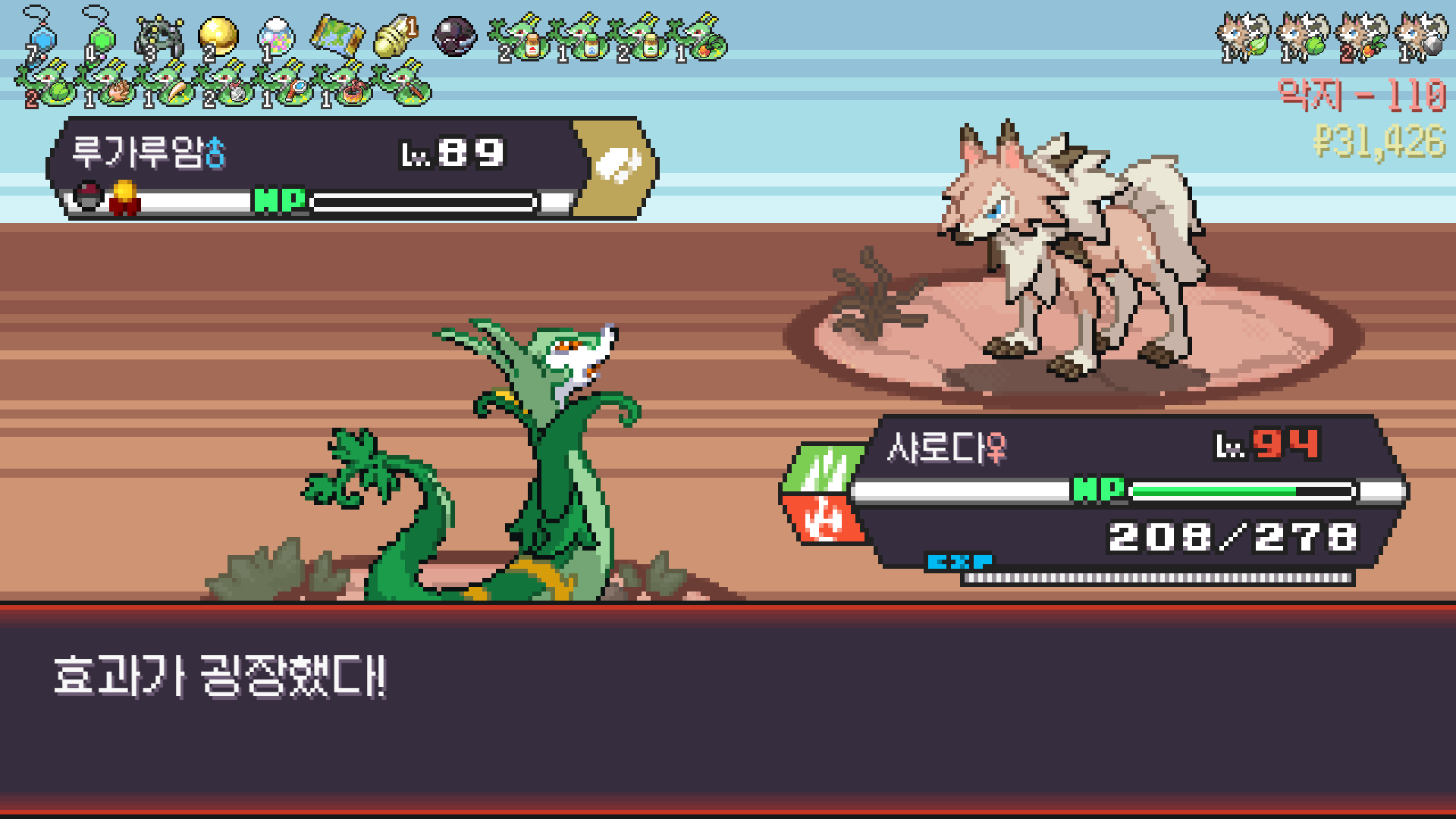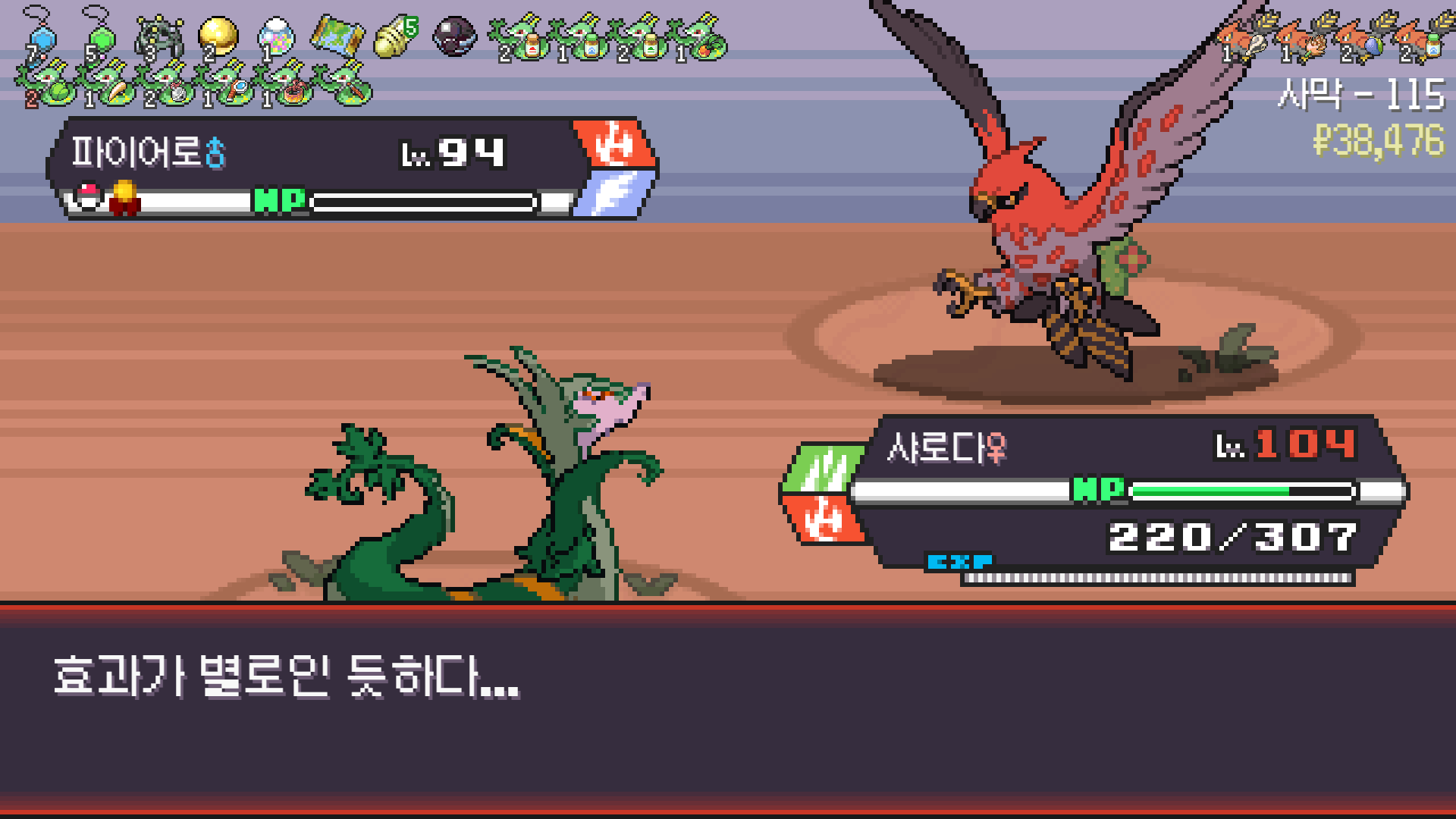 사다이사의 작아지기 3번 후 모래뿜기 + 엄습하는일격으로 1페 넘기고