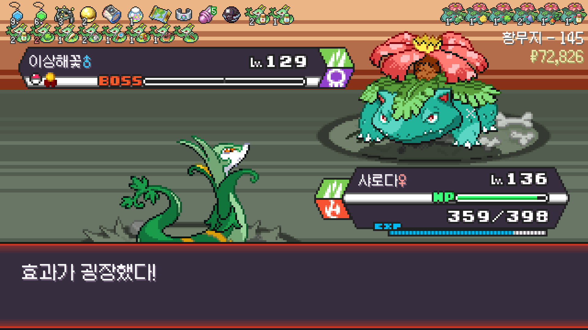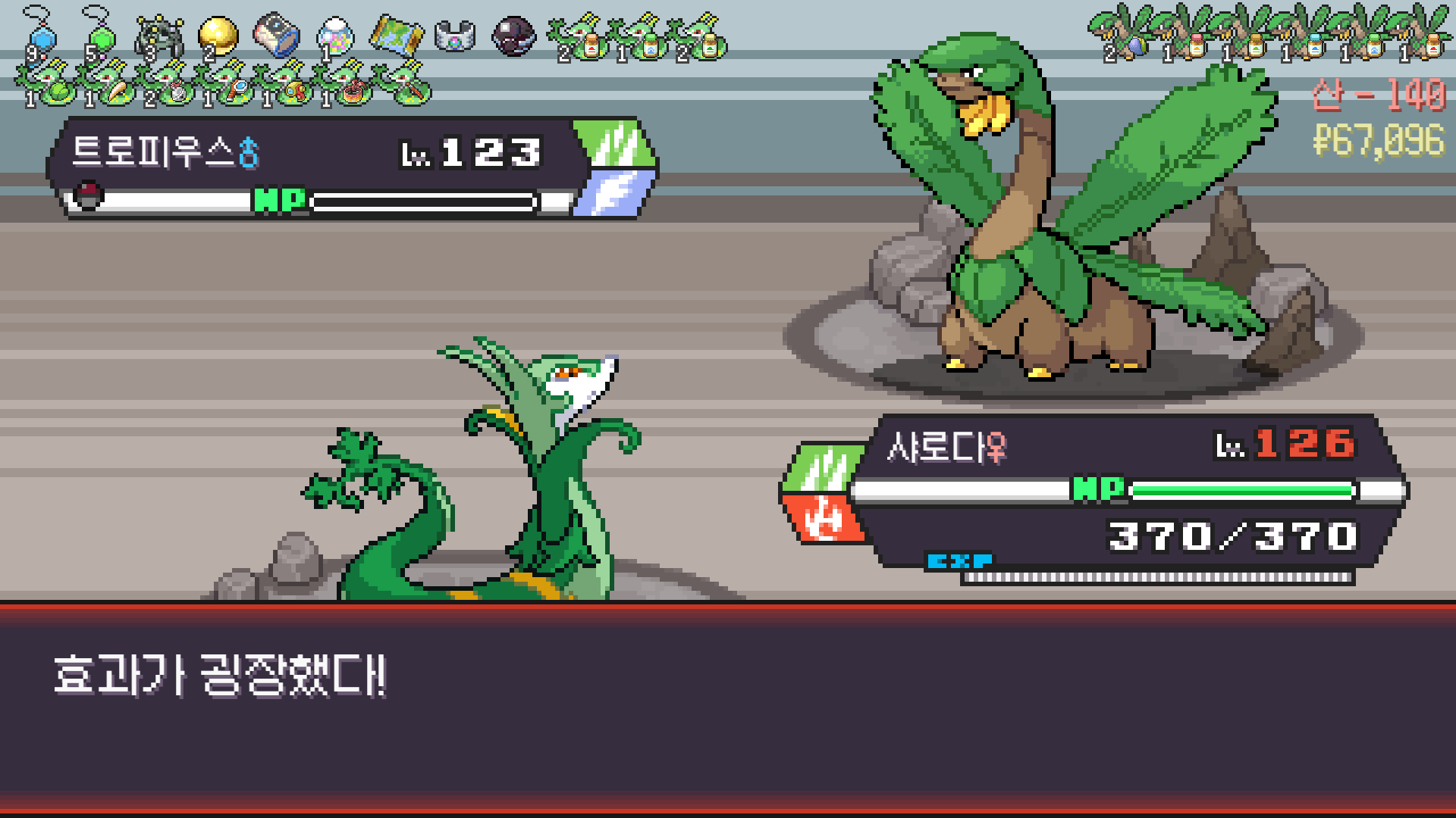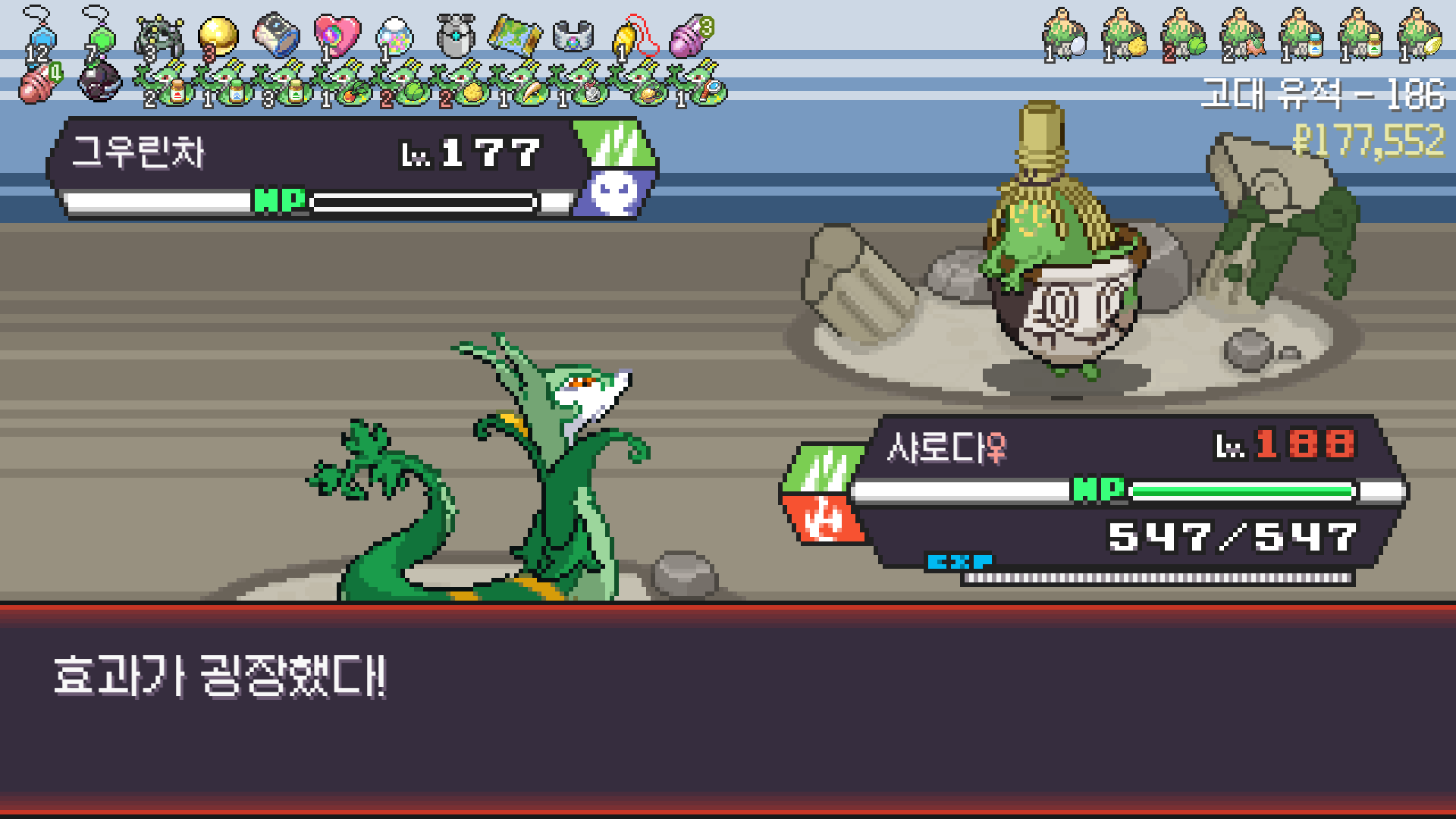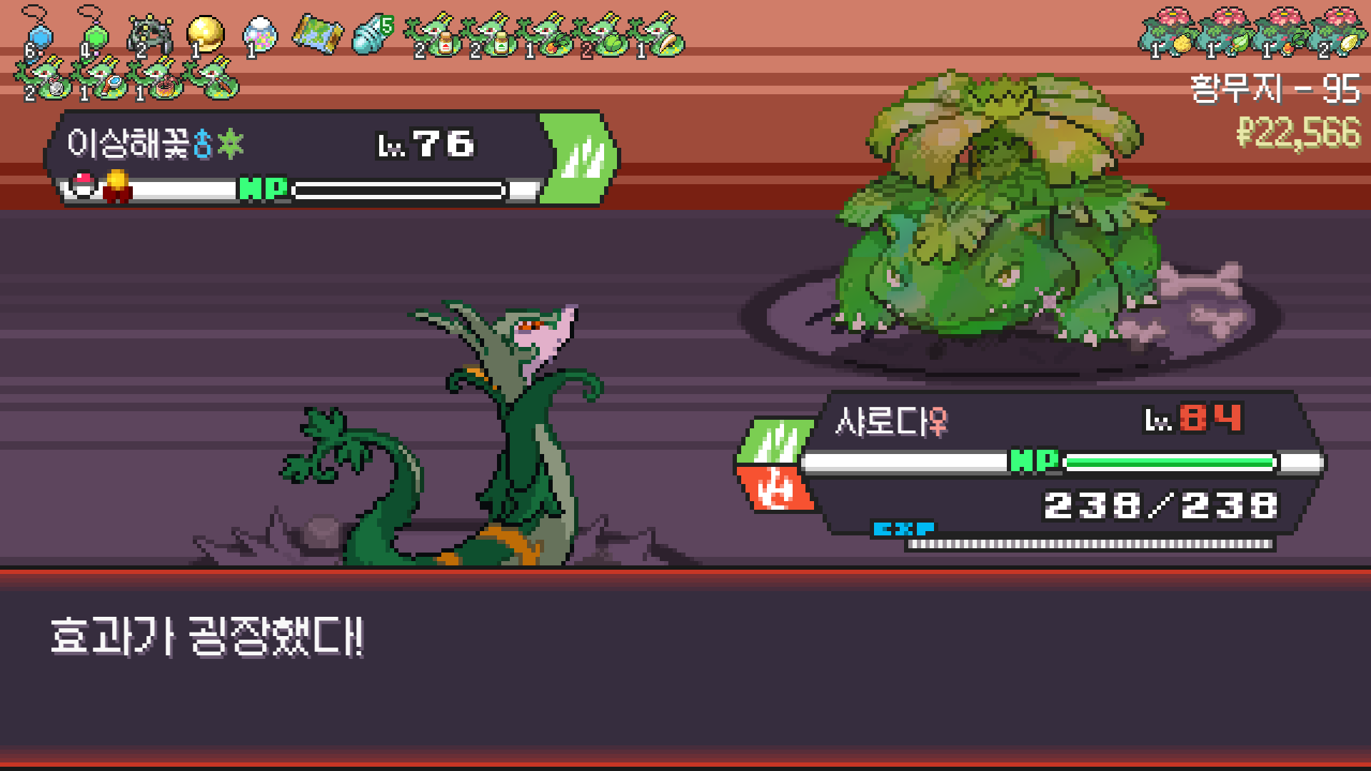 심술꾸러기, 멀티렌즈, 리프스톰 삼신기가 완성되고 타입이 풀/불꽃 변경되니 불도저 마냥 다 밀어버린 에이스