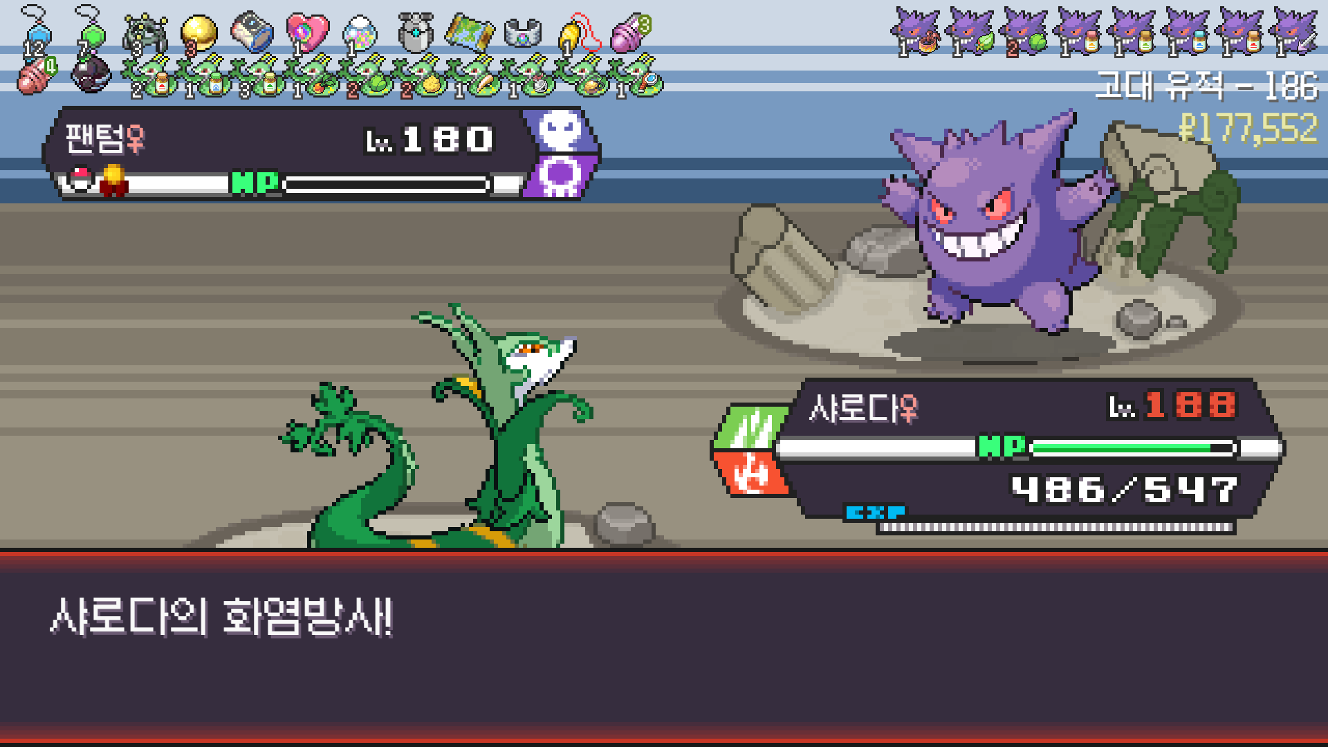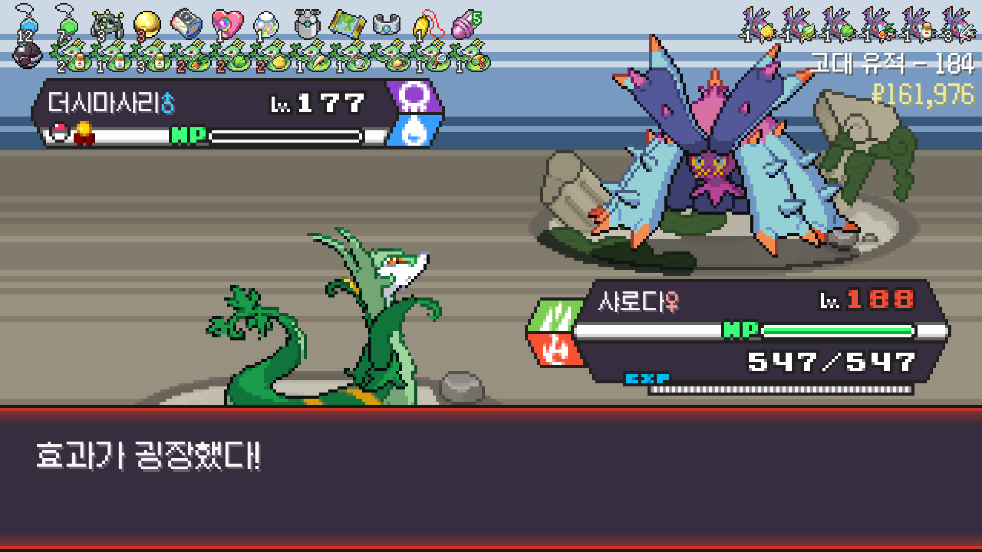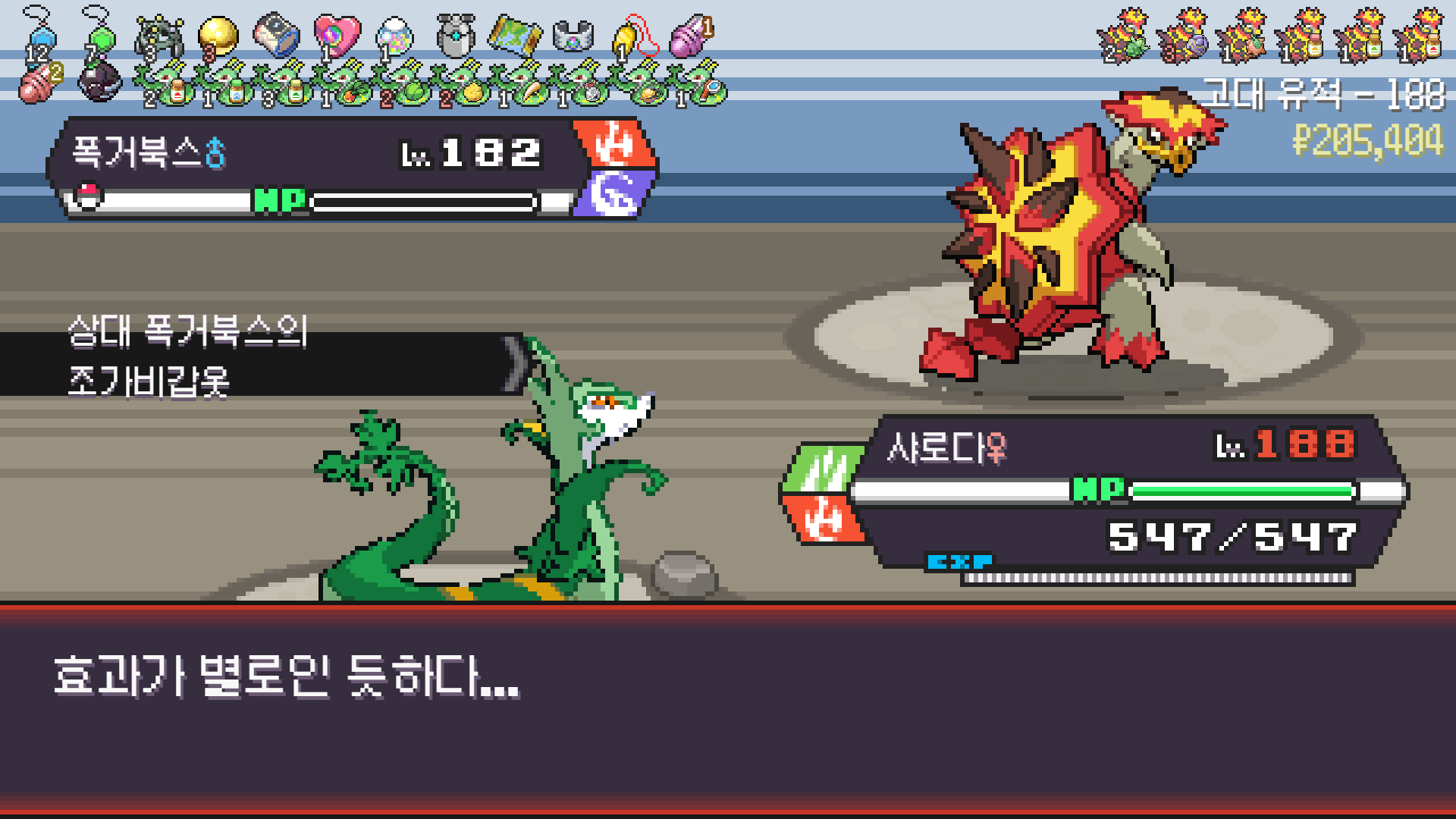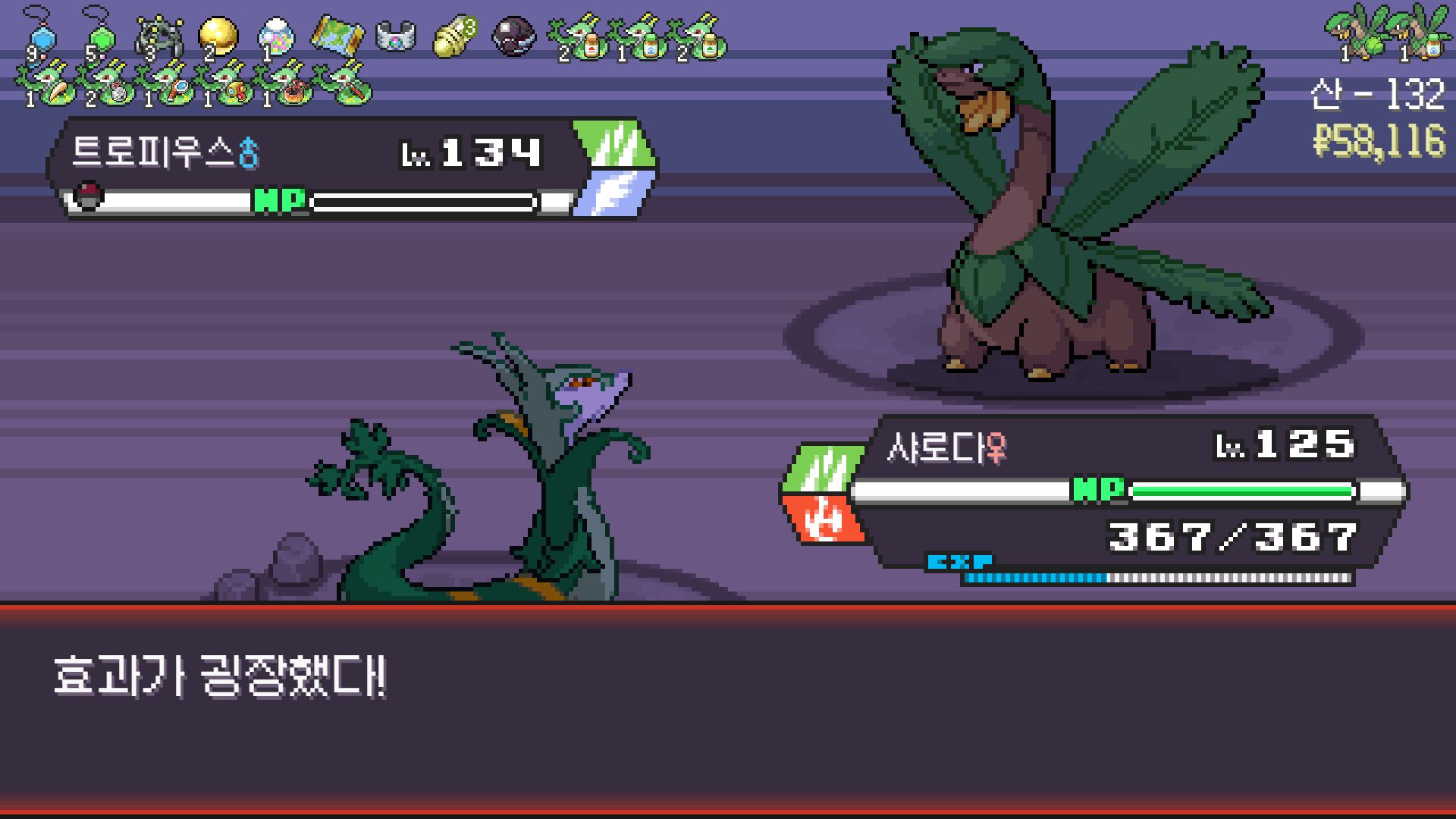 심술꾸러기, 멀티렌즈, 리프스톰 삼신기가 완성되고 타입이 풀/불꽃 변경되니 불도저 마냥 다 밀어버린 에이스