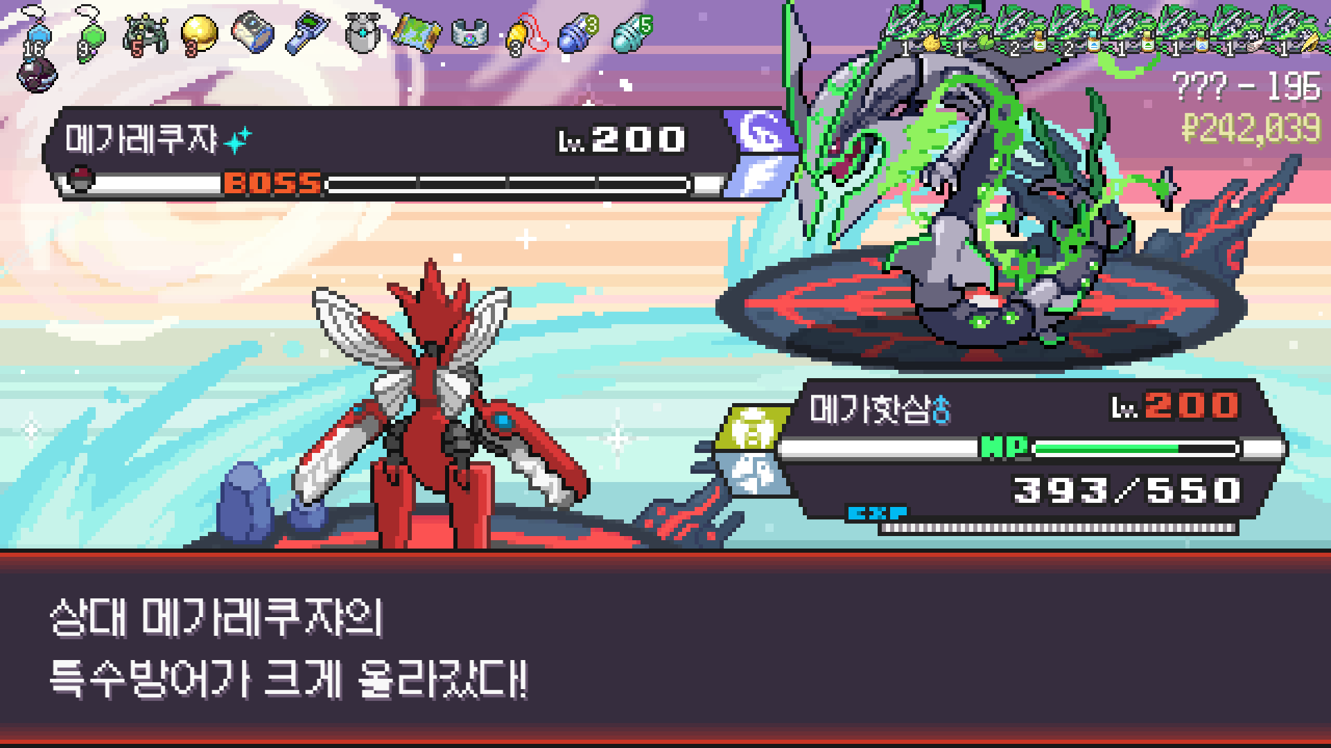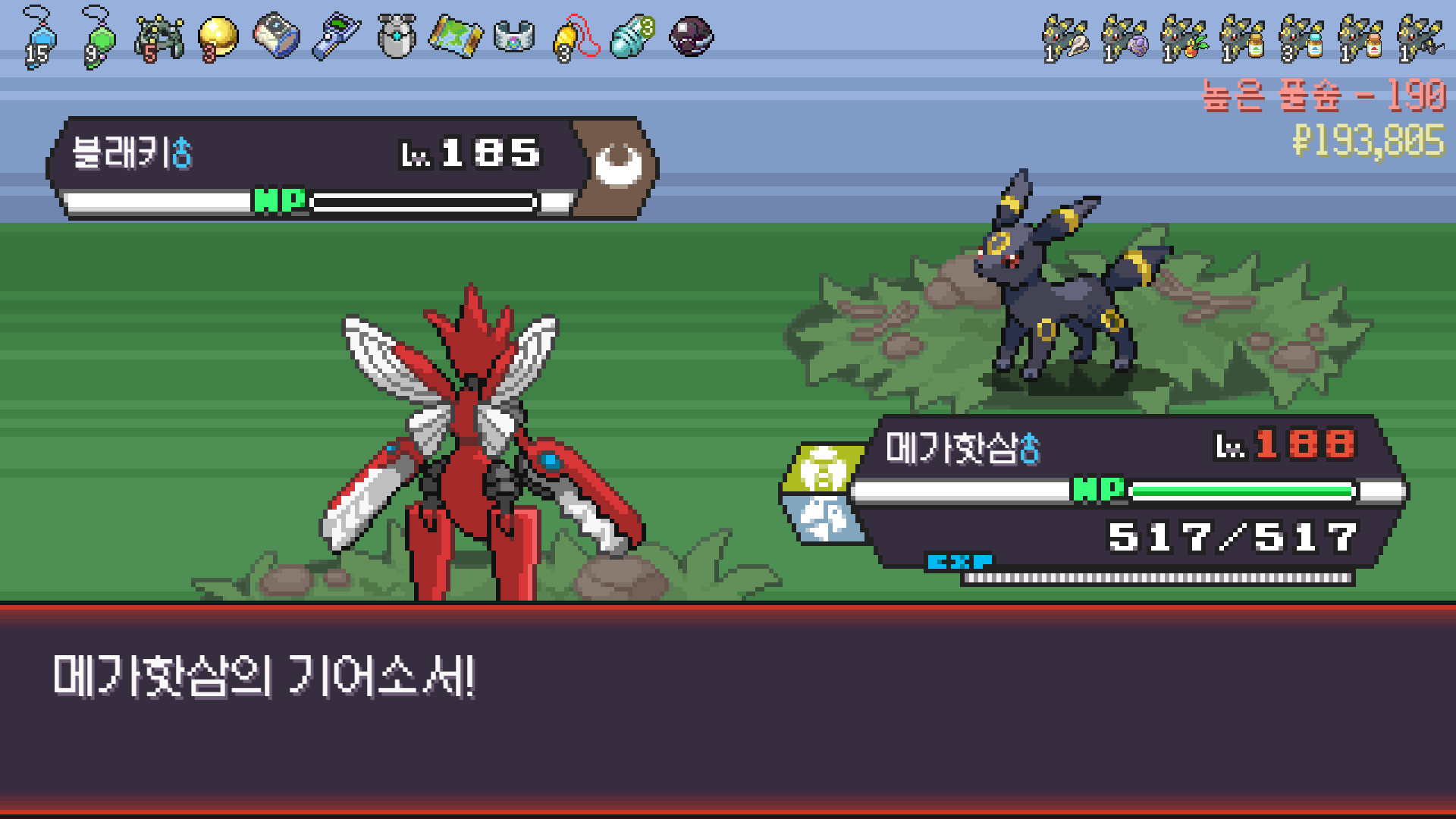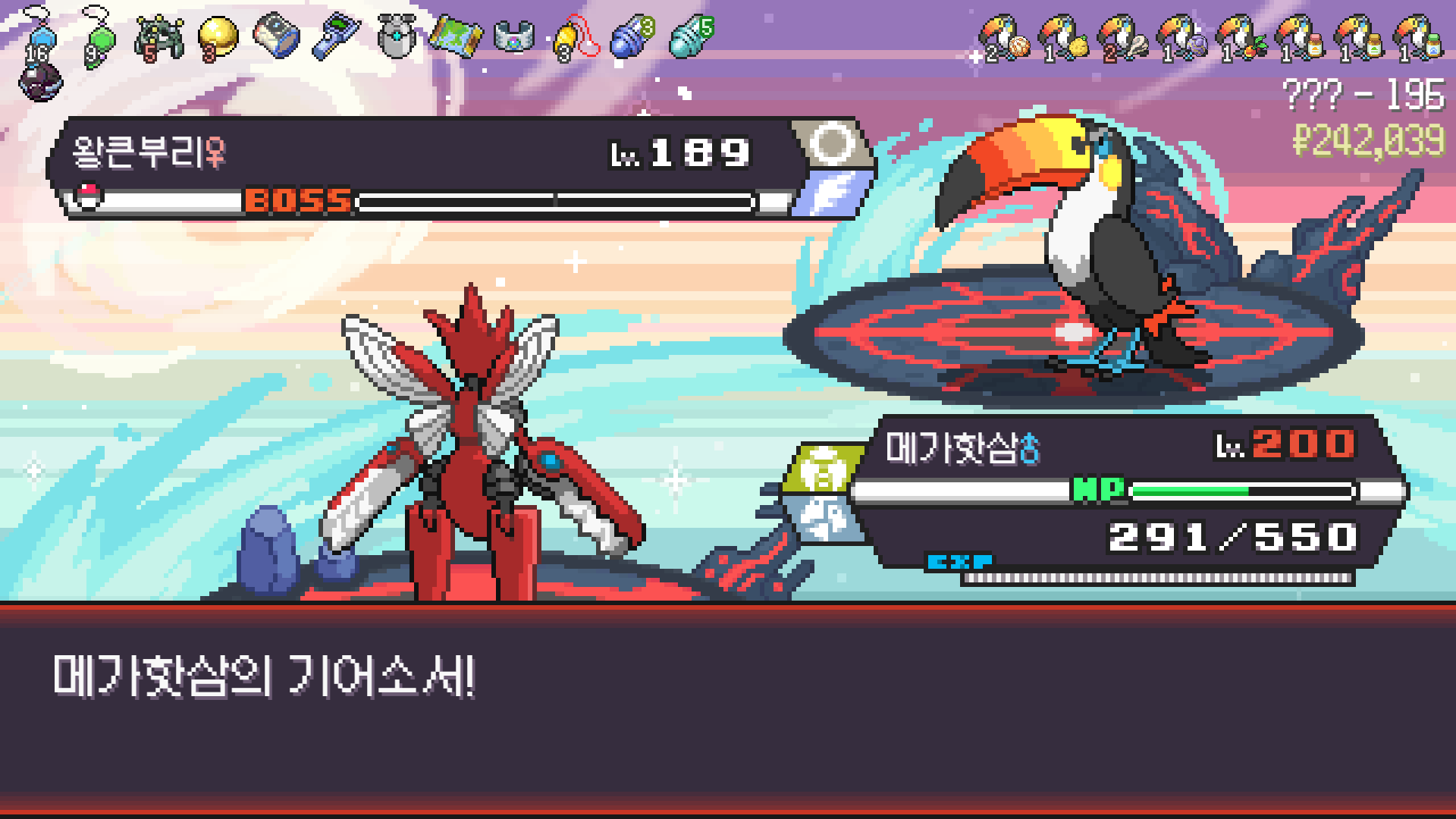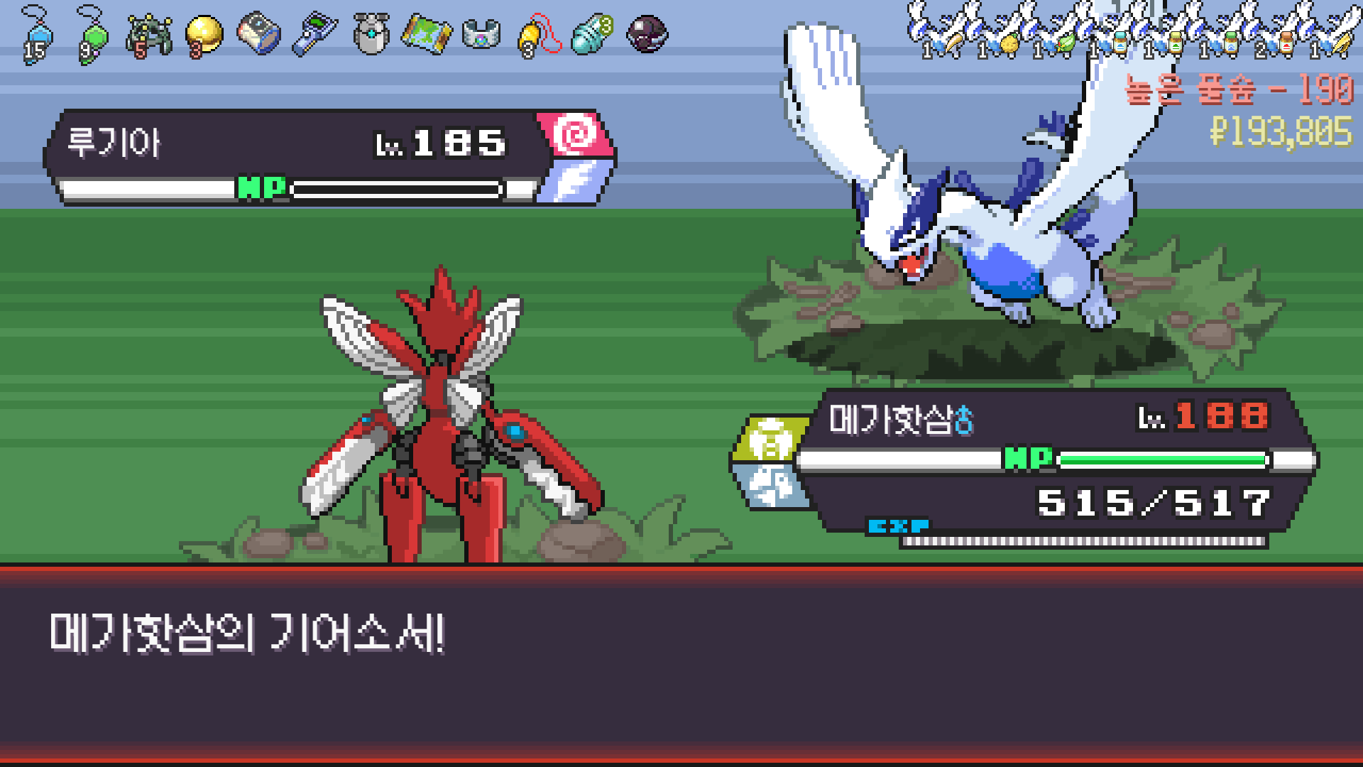 왕큰부리 앞에서 준비작업 끝내고 기어소서로 메가레쿠쟈 원콤