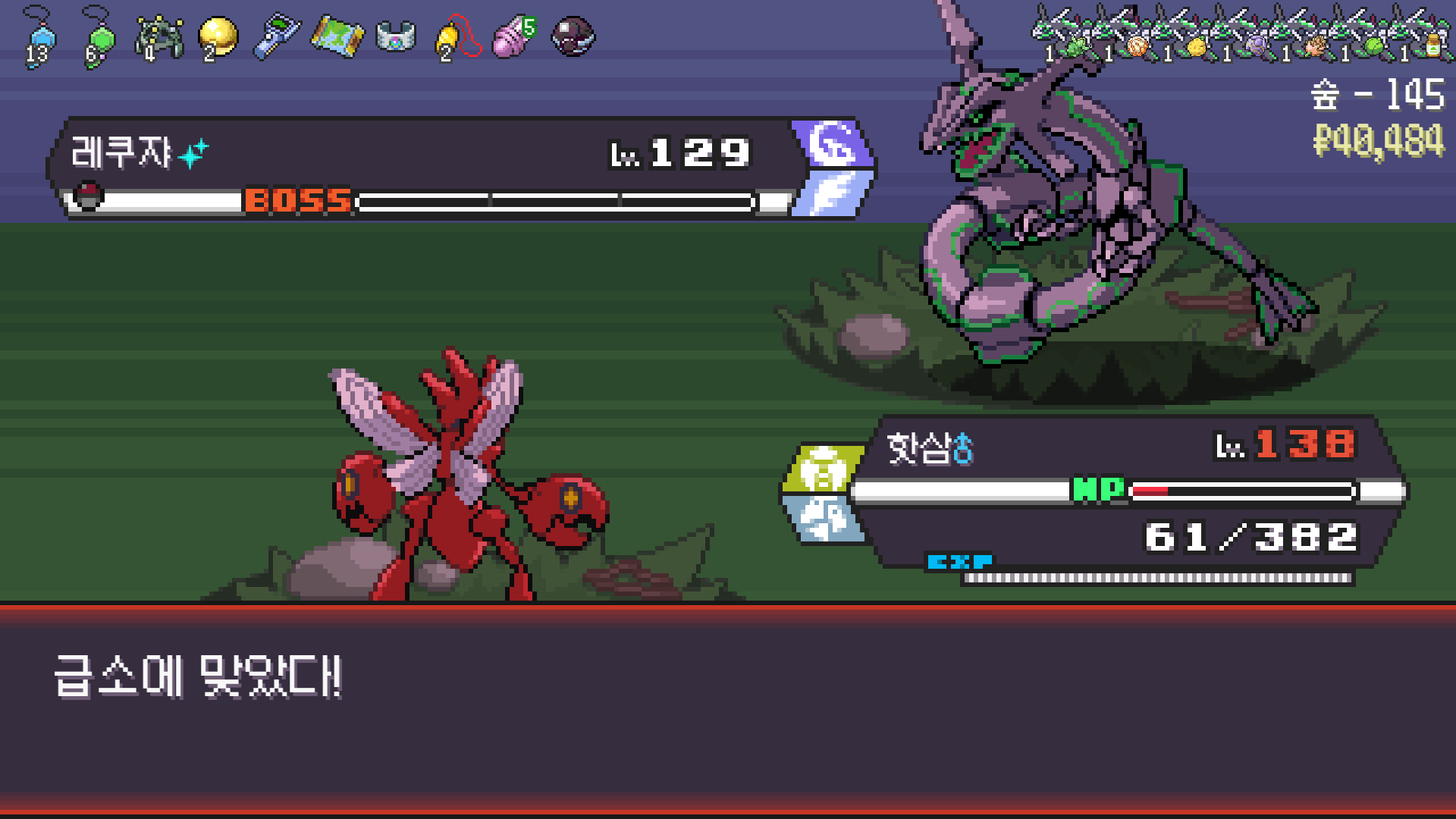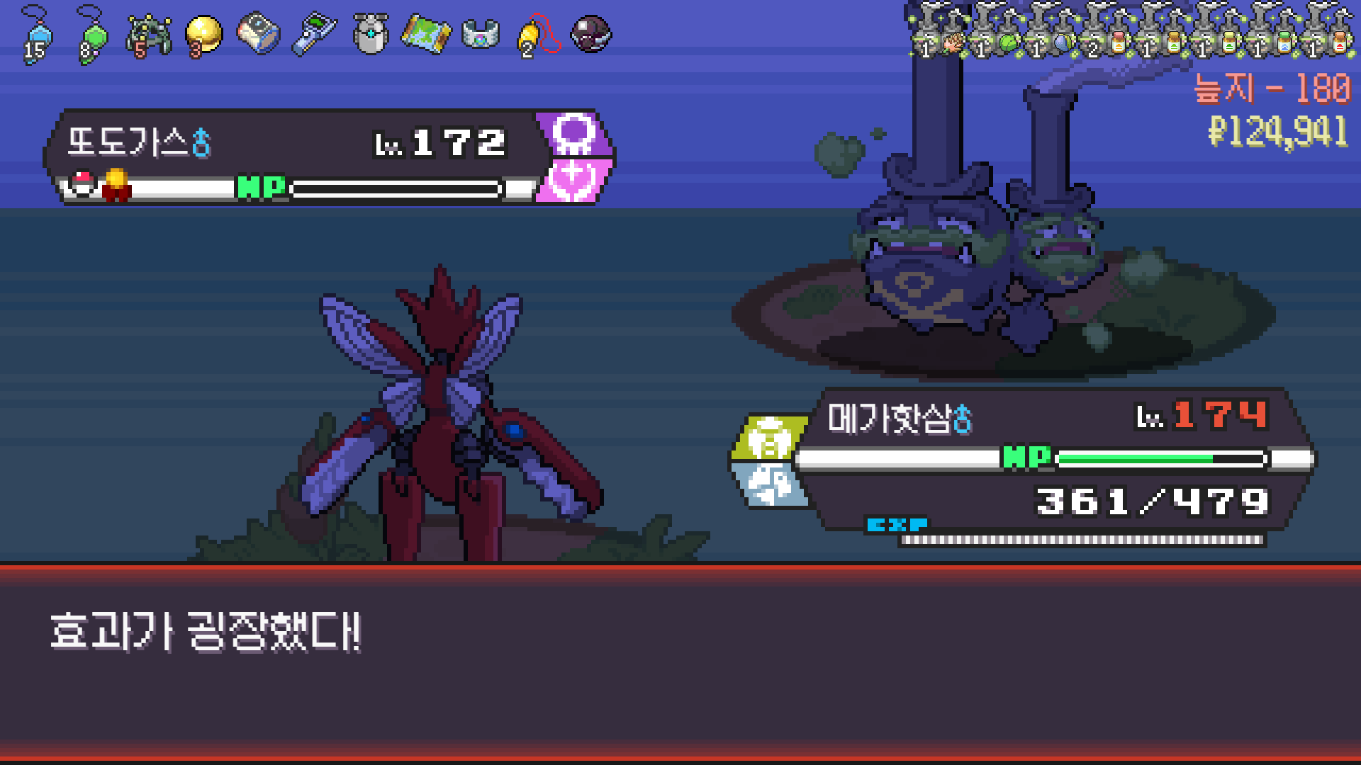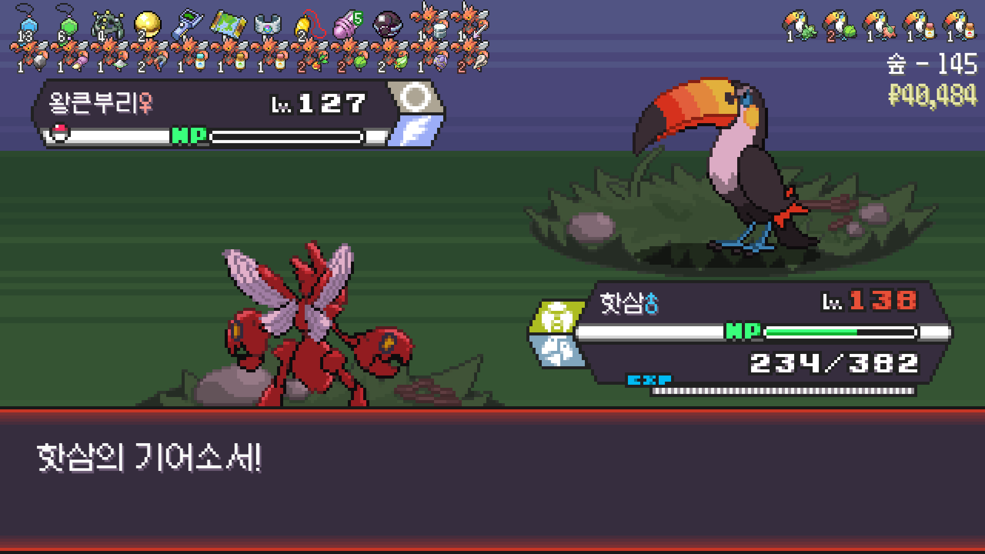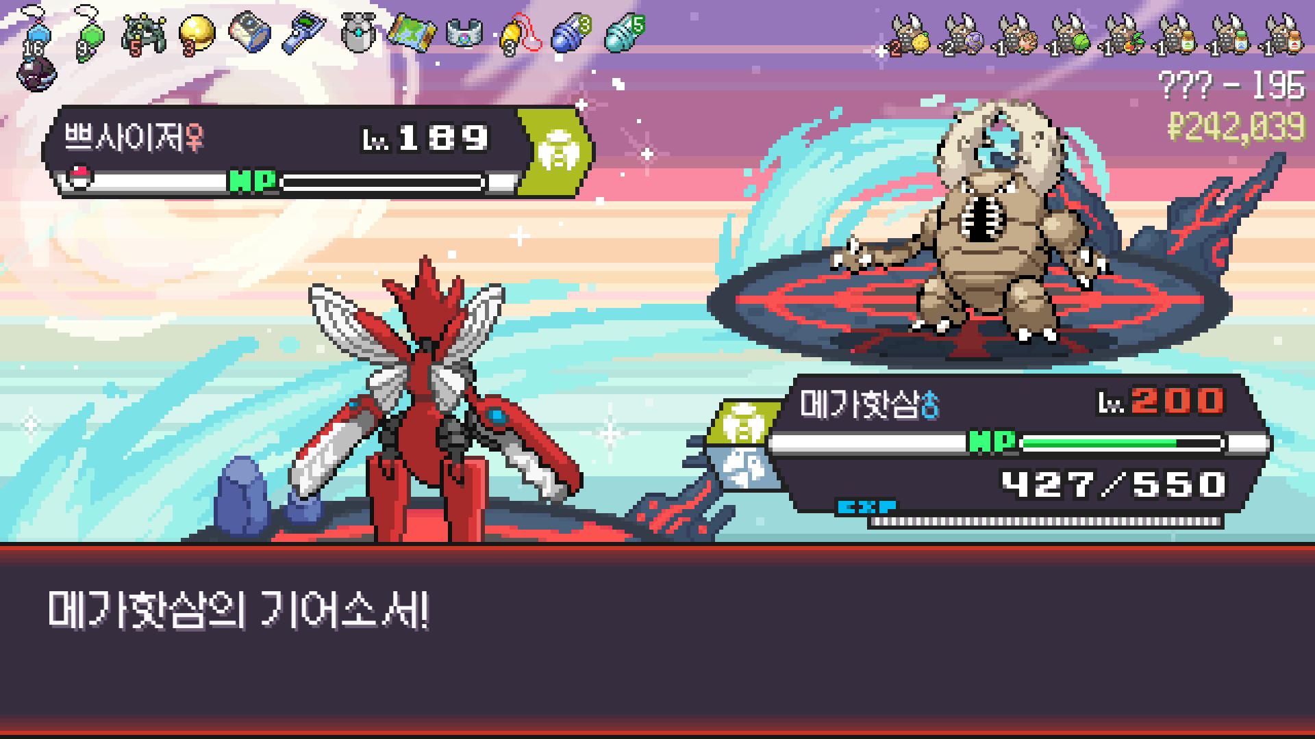 왕큰부리 앞에서 준비작업 끝내고 기어소서로 메가레쿠쟈 원콤