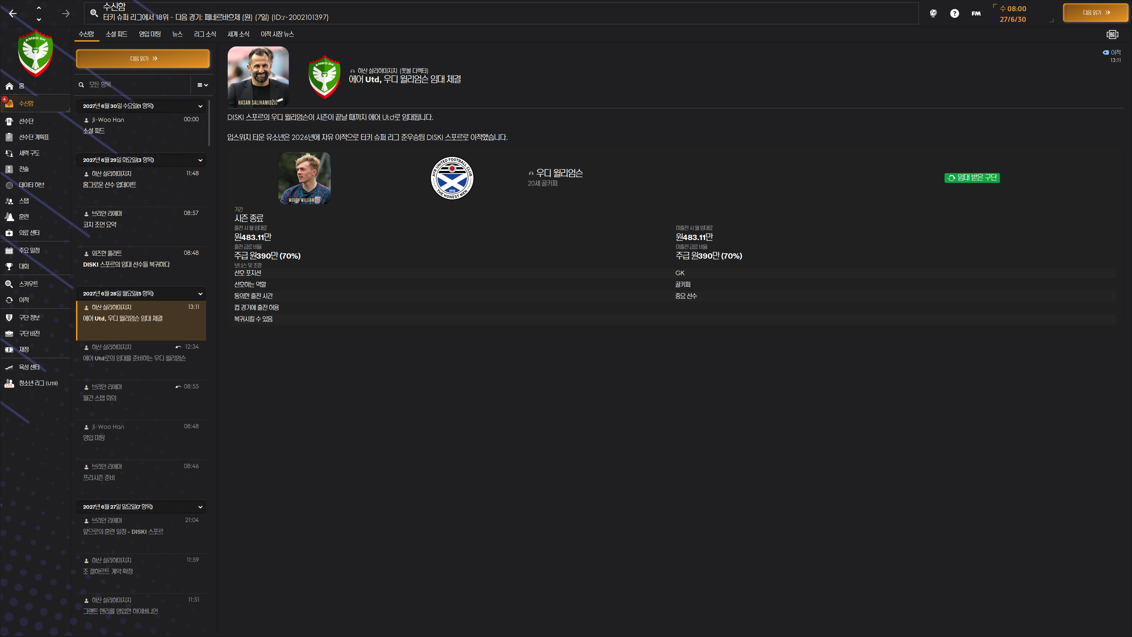 용병 슬롯 제한 때문에 우디는 임대 보내주고