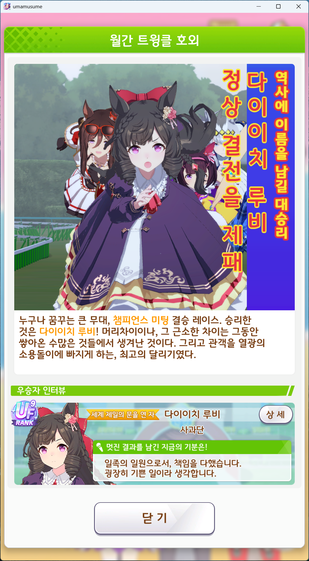 | 우마무스메 프리티 더비 챔피언스 미팅 MILE 우승 (0) | 2024.10.11 |