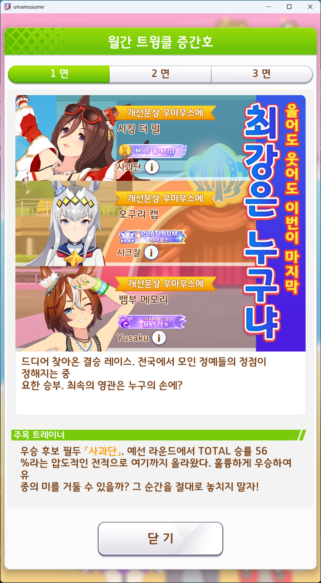 | 우마무스메 프리티 더비 2회차 리그 오브 히어로스 플래티넘2 (0) | 2024.11.23 |