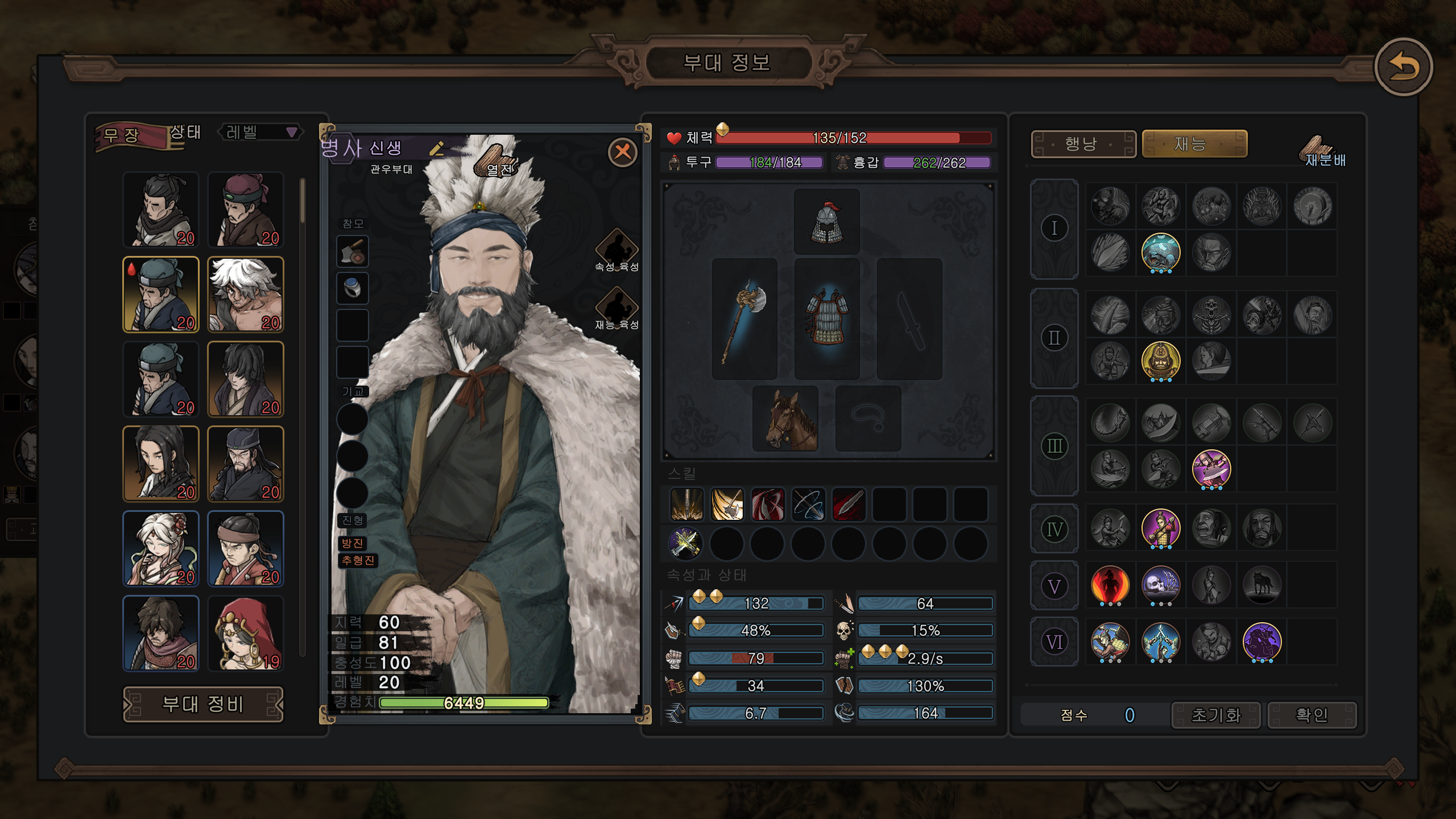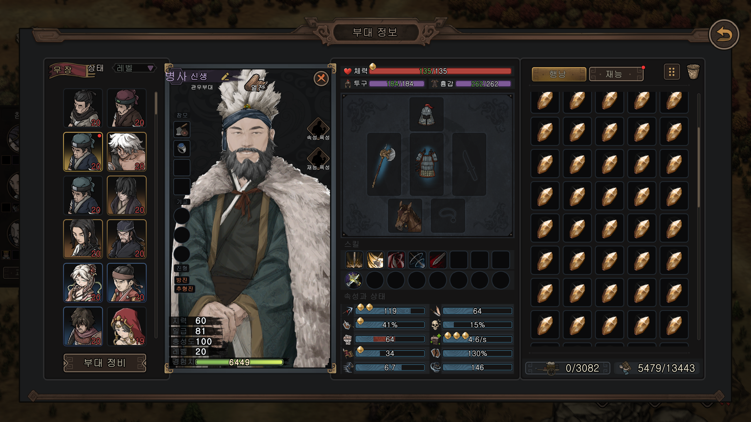 체력 135 > 152, 장병기 숙련 119 > 132, 막기 41 > 48, 기력 64 > 79, 회전속도 146 > 164로 올라갔다