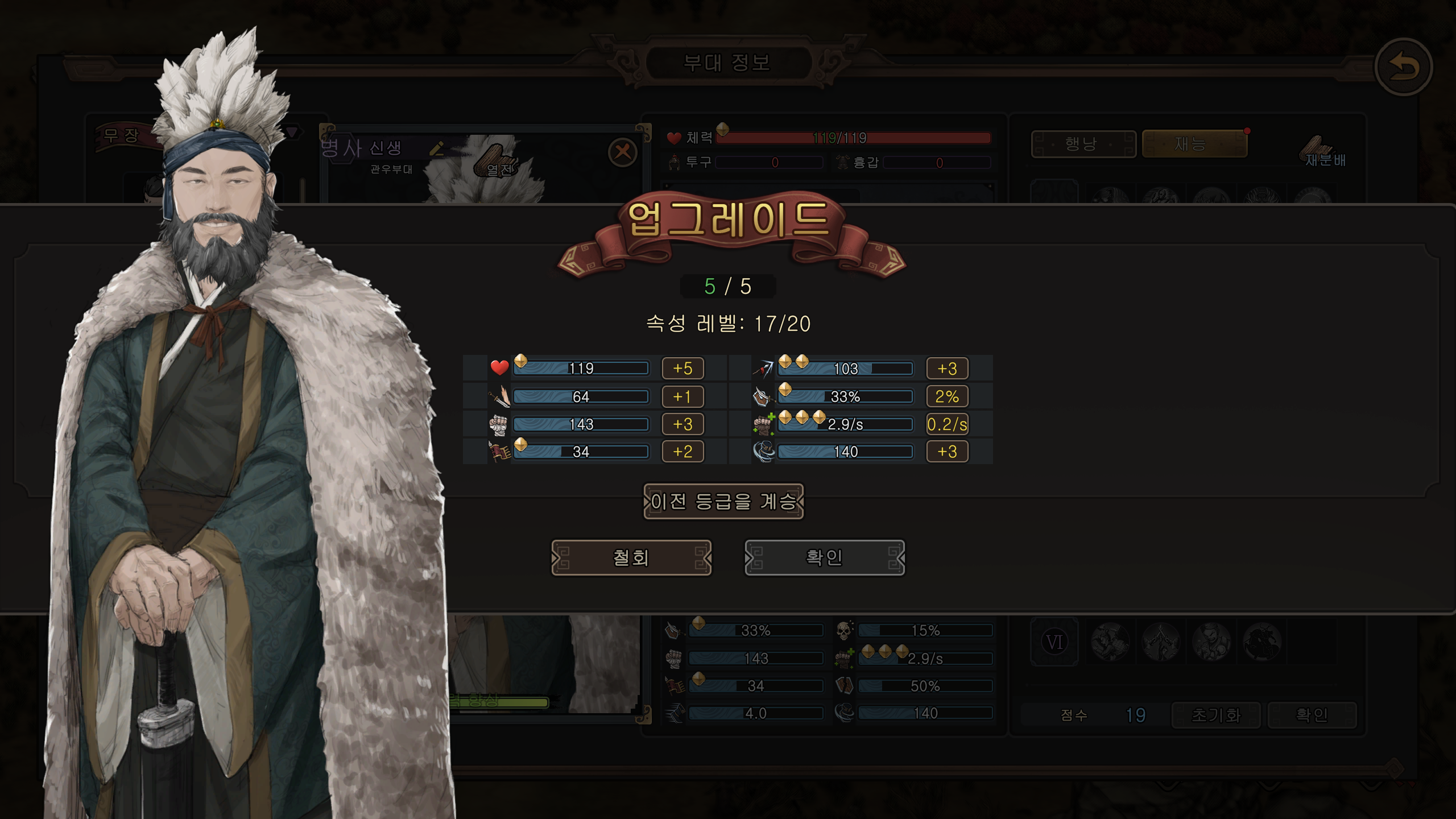 이 캐릭은 체력 1별 >> 5, 장병기숙련 2별 >> 3, 막기 1별 >> 2, 기력 0별 >> 3, 회전속도0별 >> 3