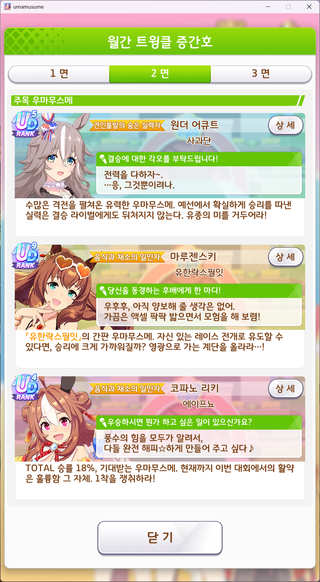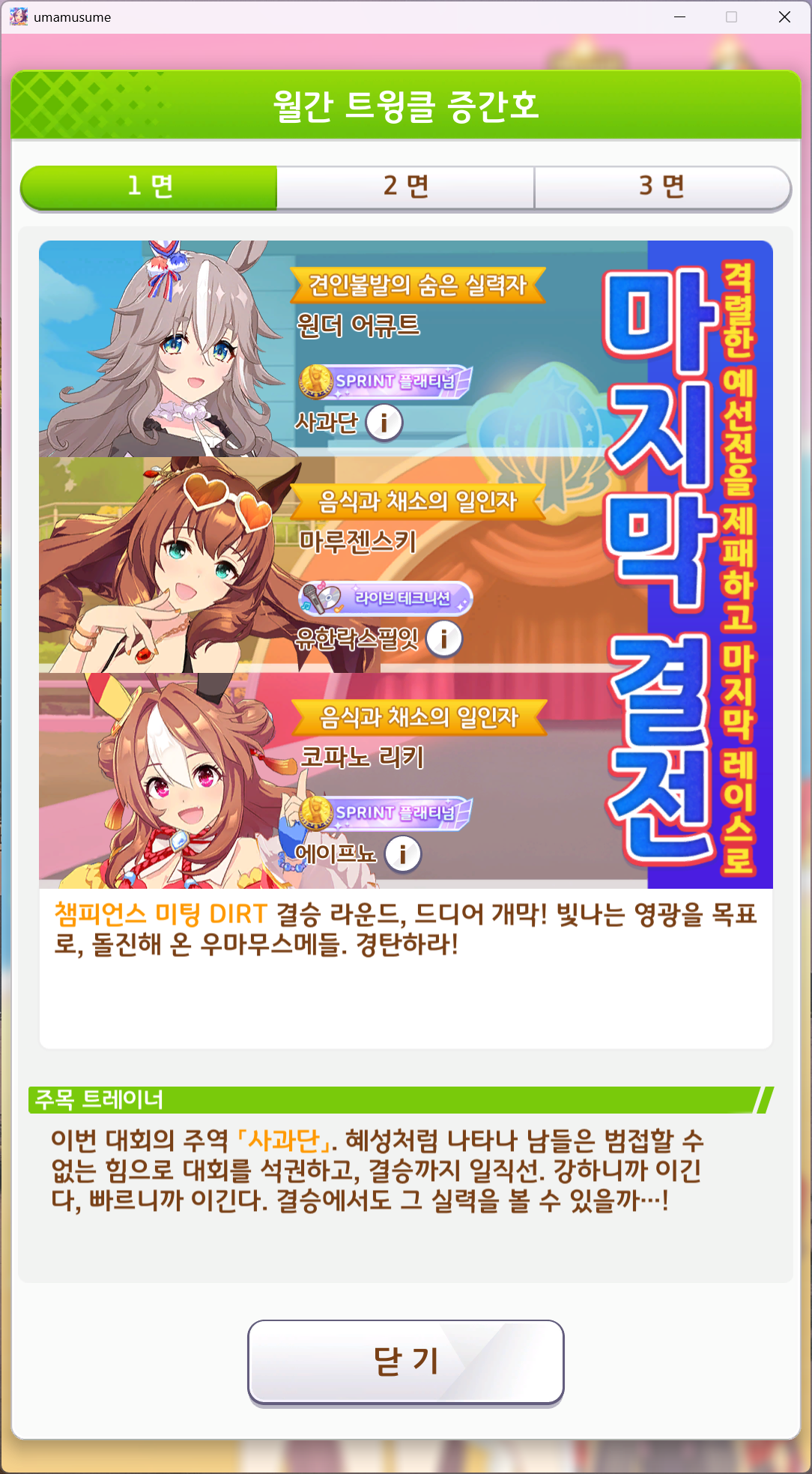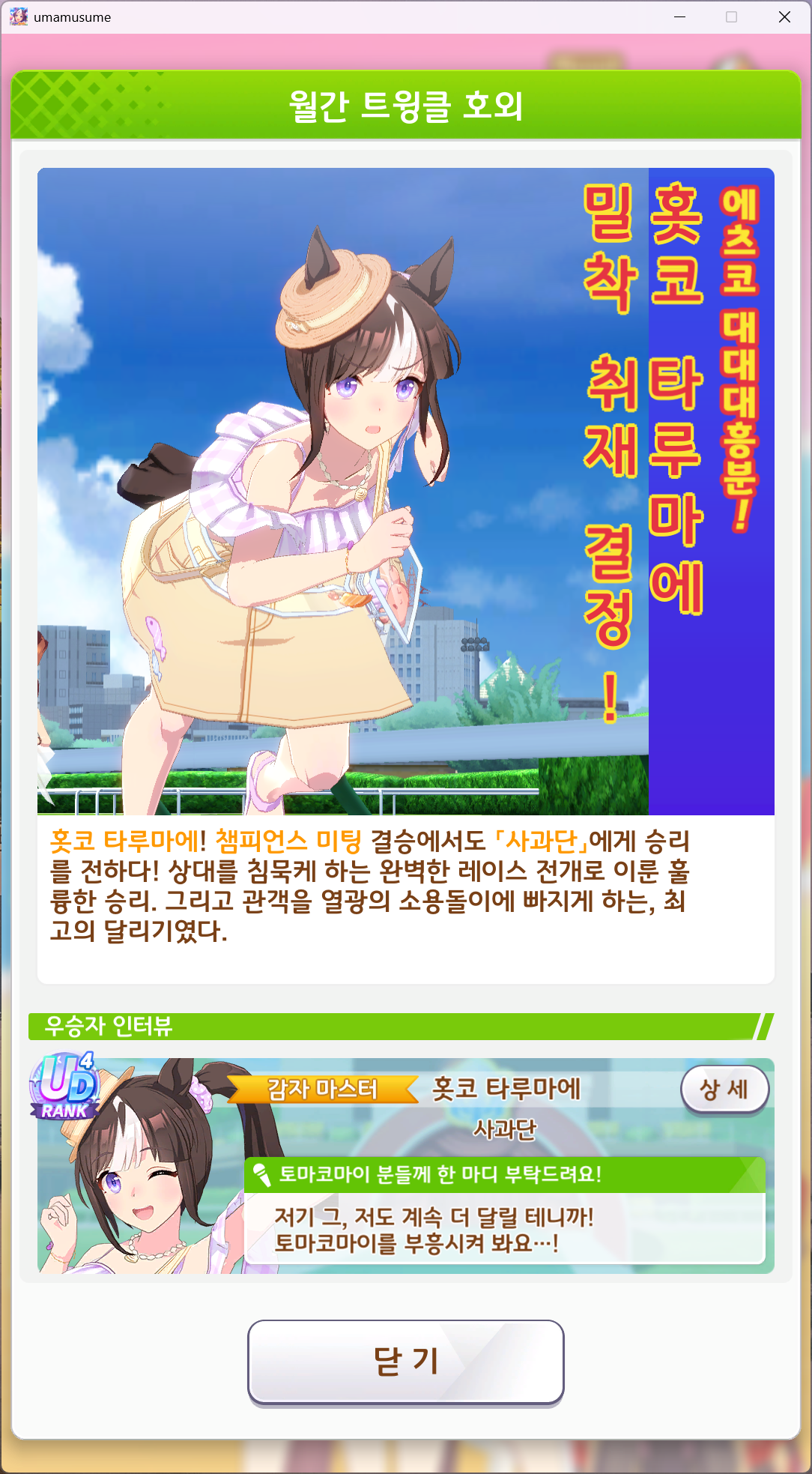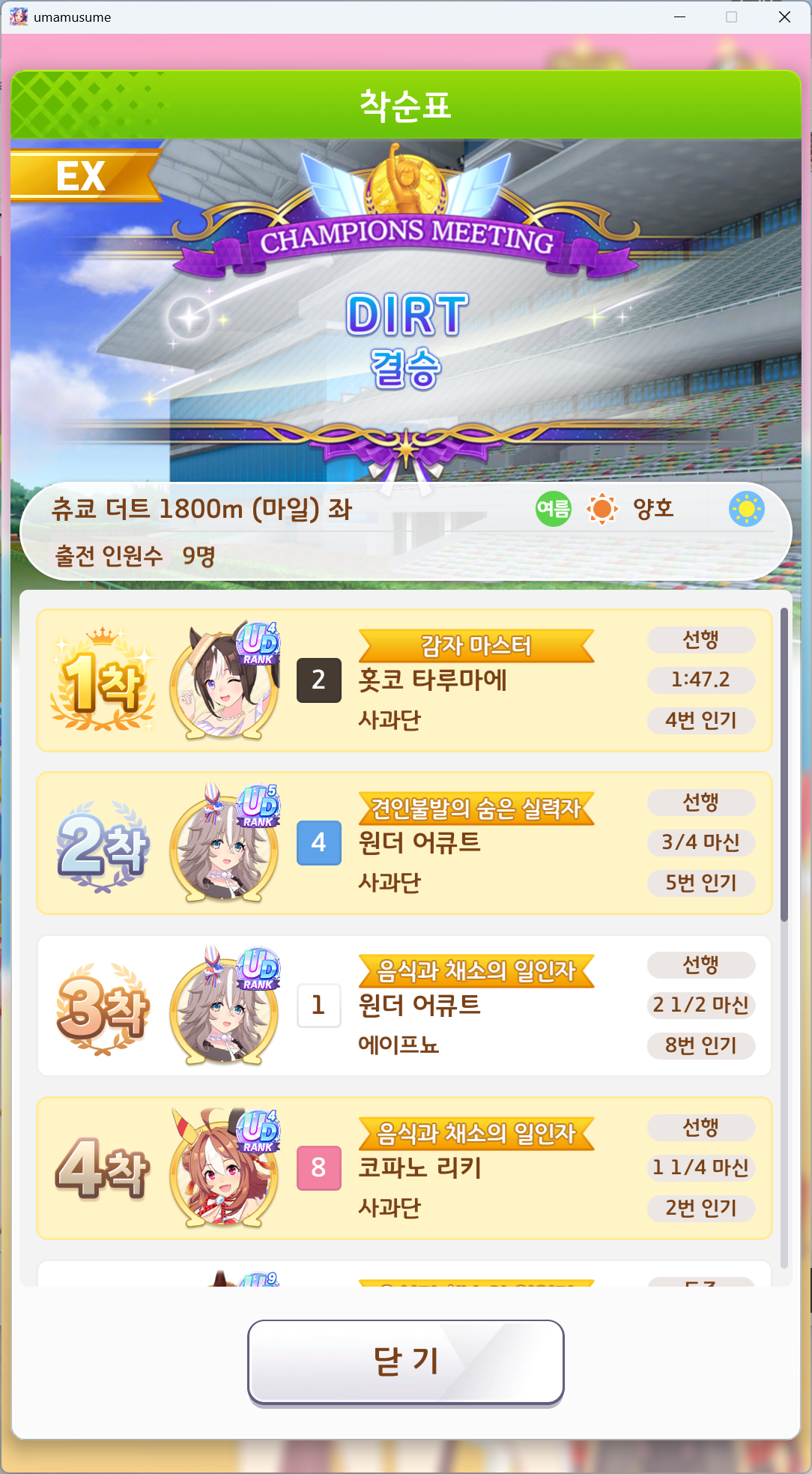 | 우마무스메 프리티 더비 챔피언스 미팅 SPRINT 우승 (6) | 2025.06.14 |