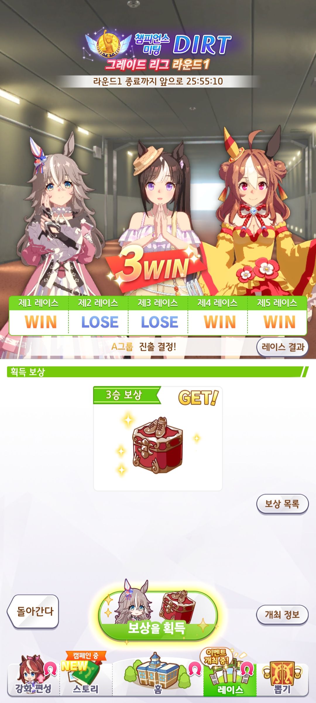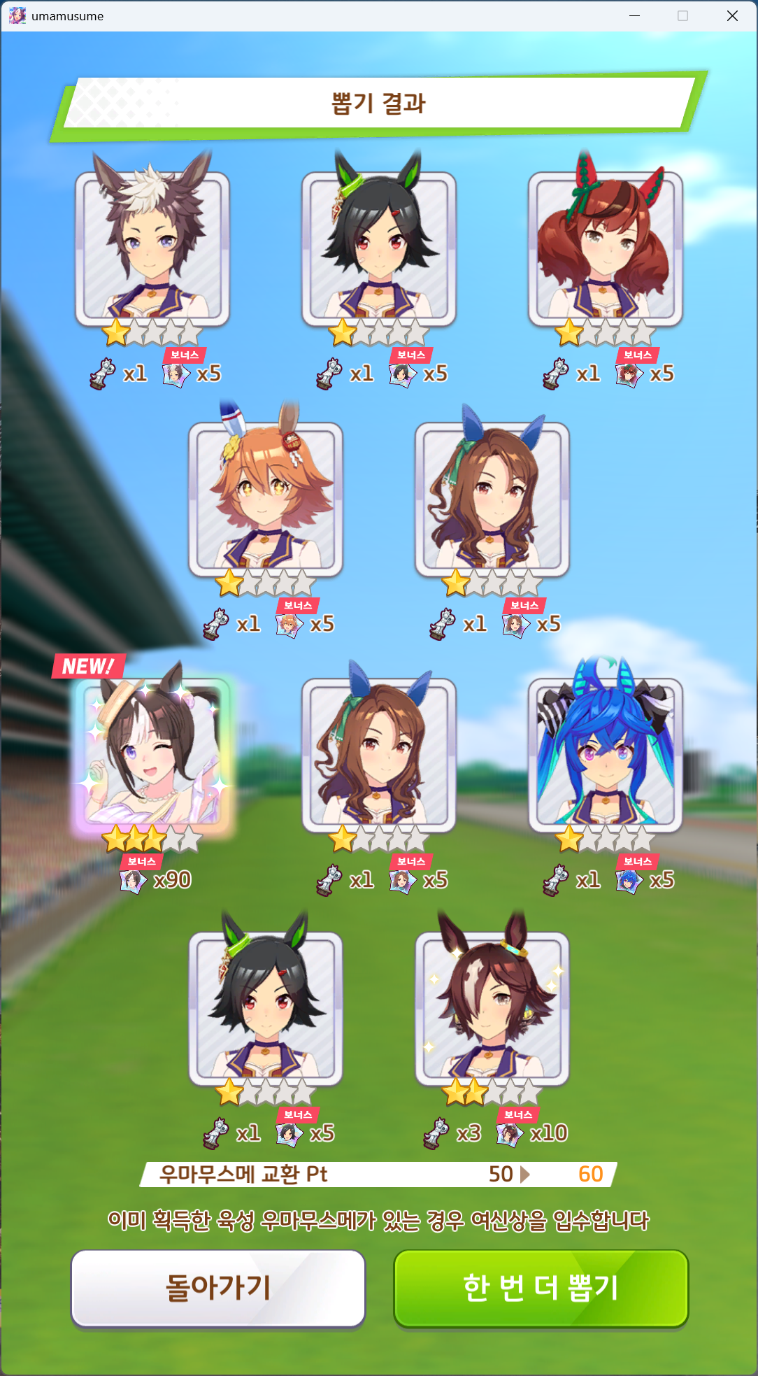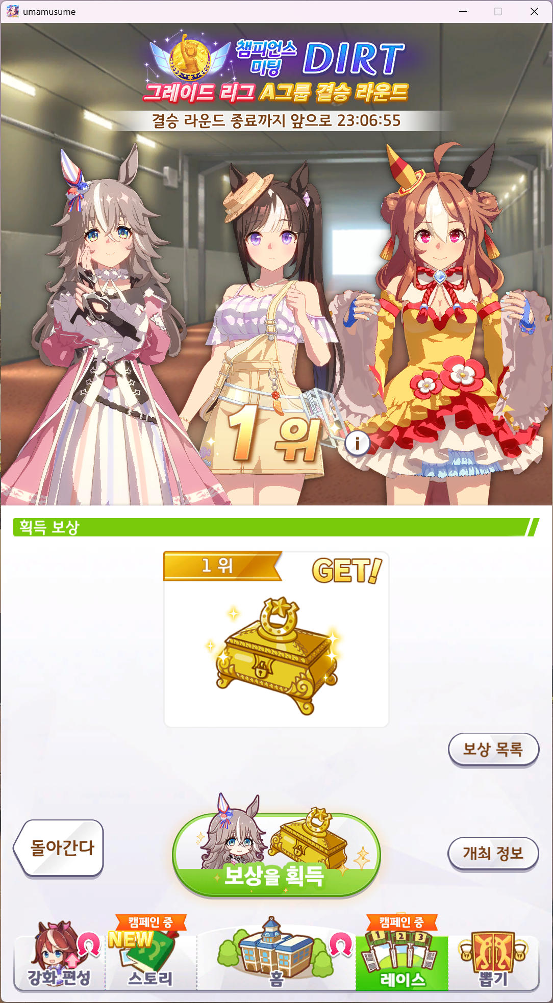 | 우마무스메 프리티 더비 챔피언스 미팅 MILE 우승 (0) | 2024.10.11 |