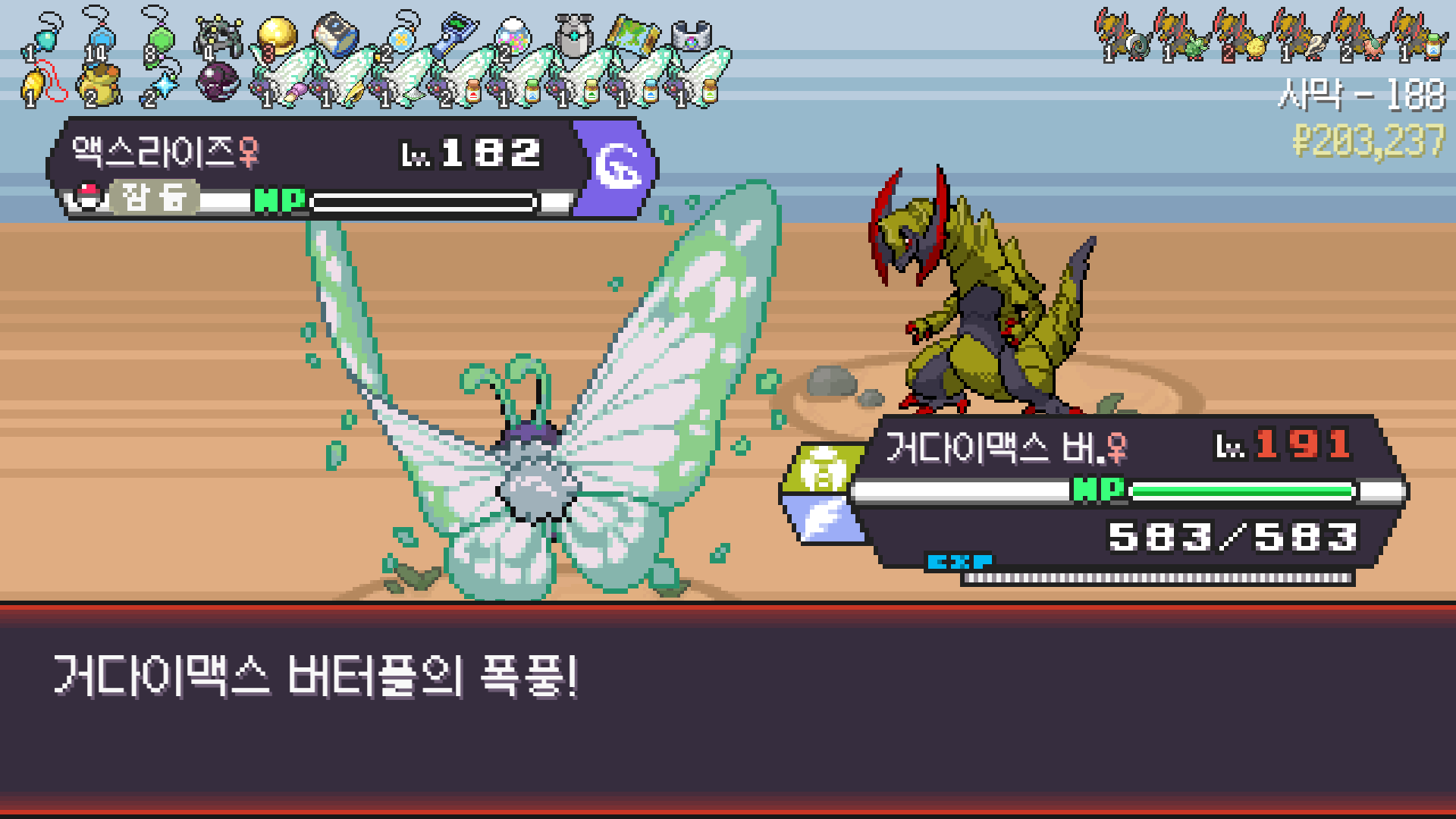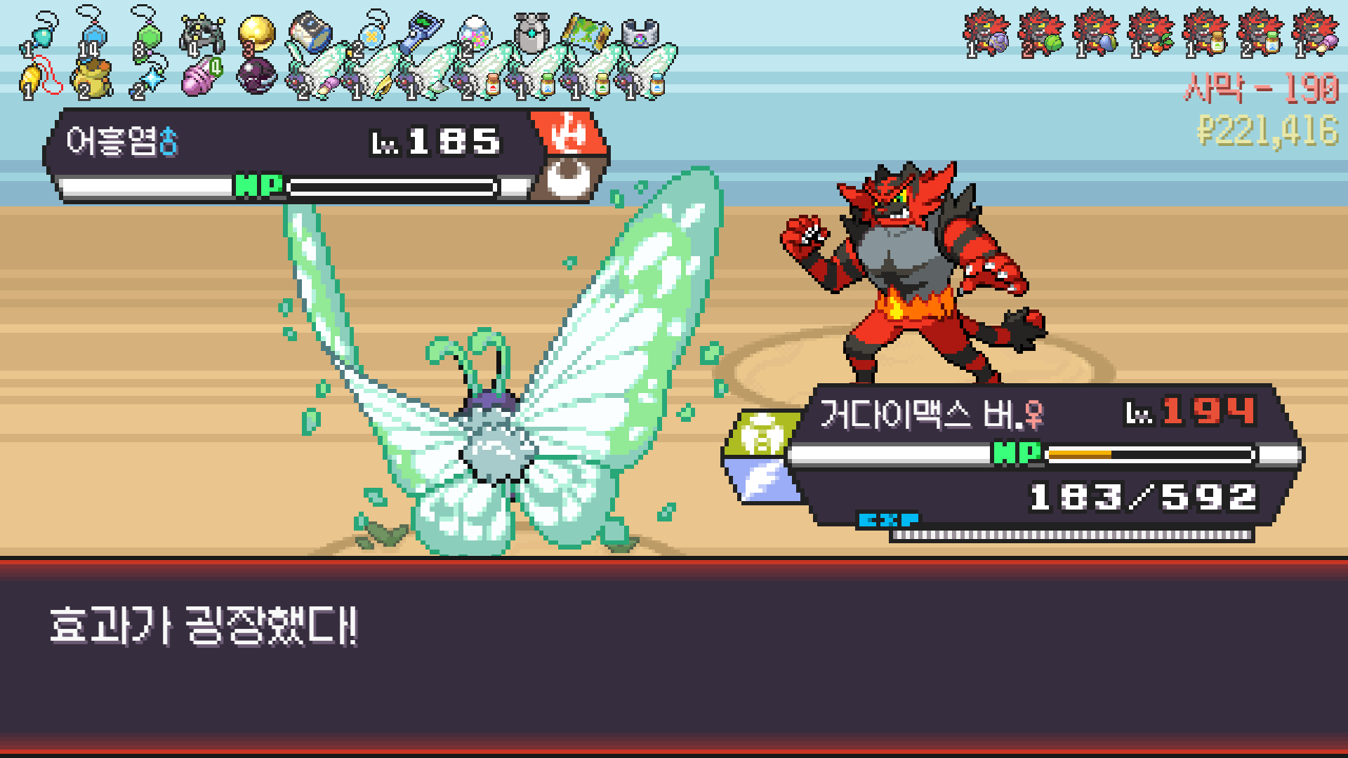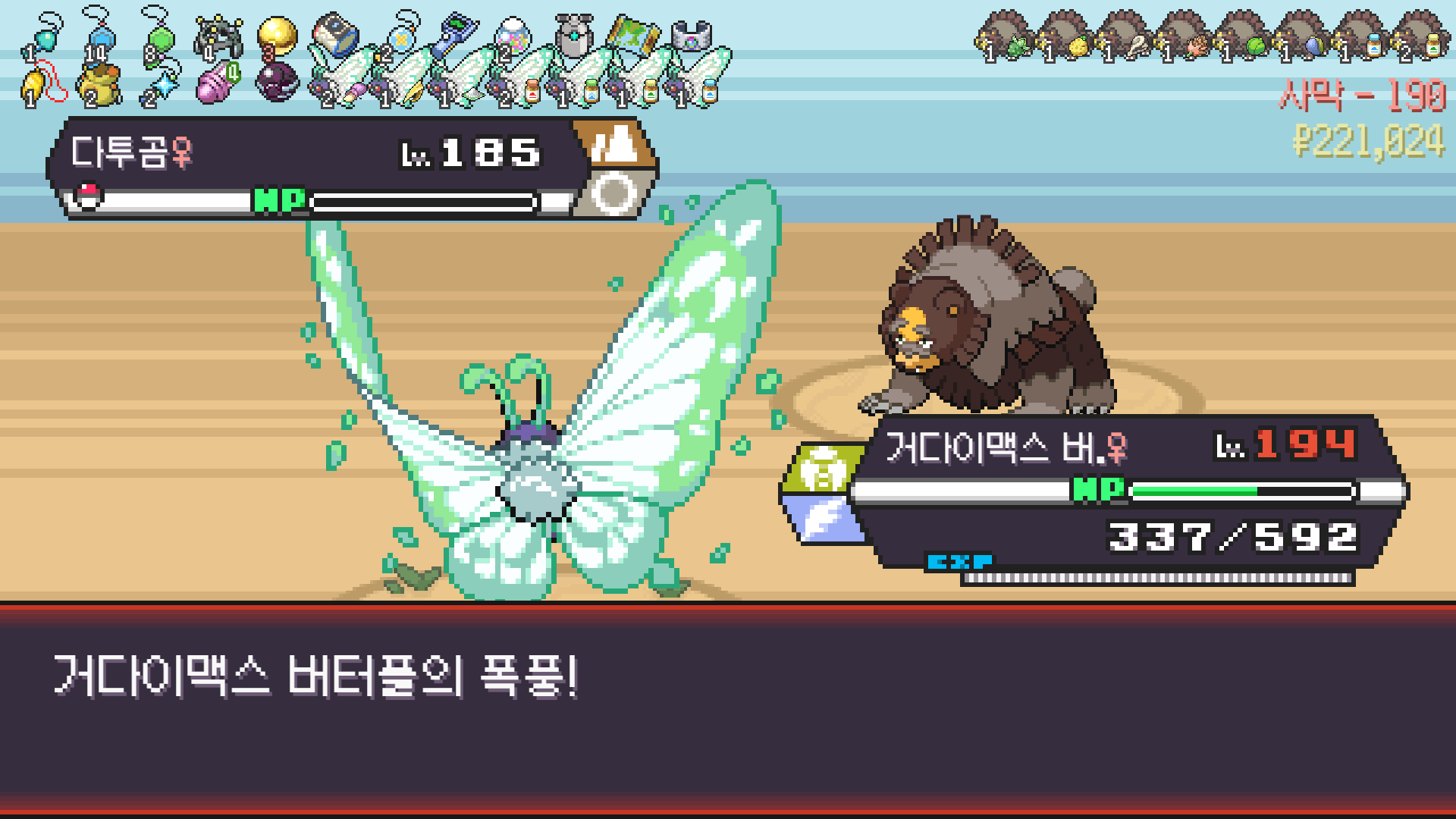 알기술 열사의폭풍과 기술머신 폭풍을 배운 후에는 바람타기 다탱구를 제외하고는 위기 없이 혼자 다 썰었다