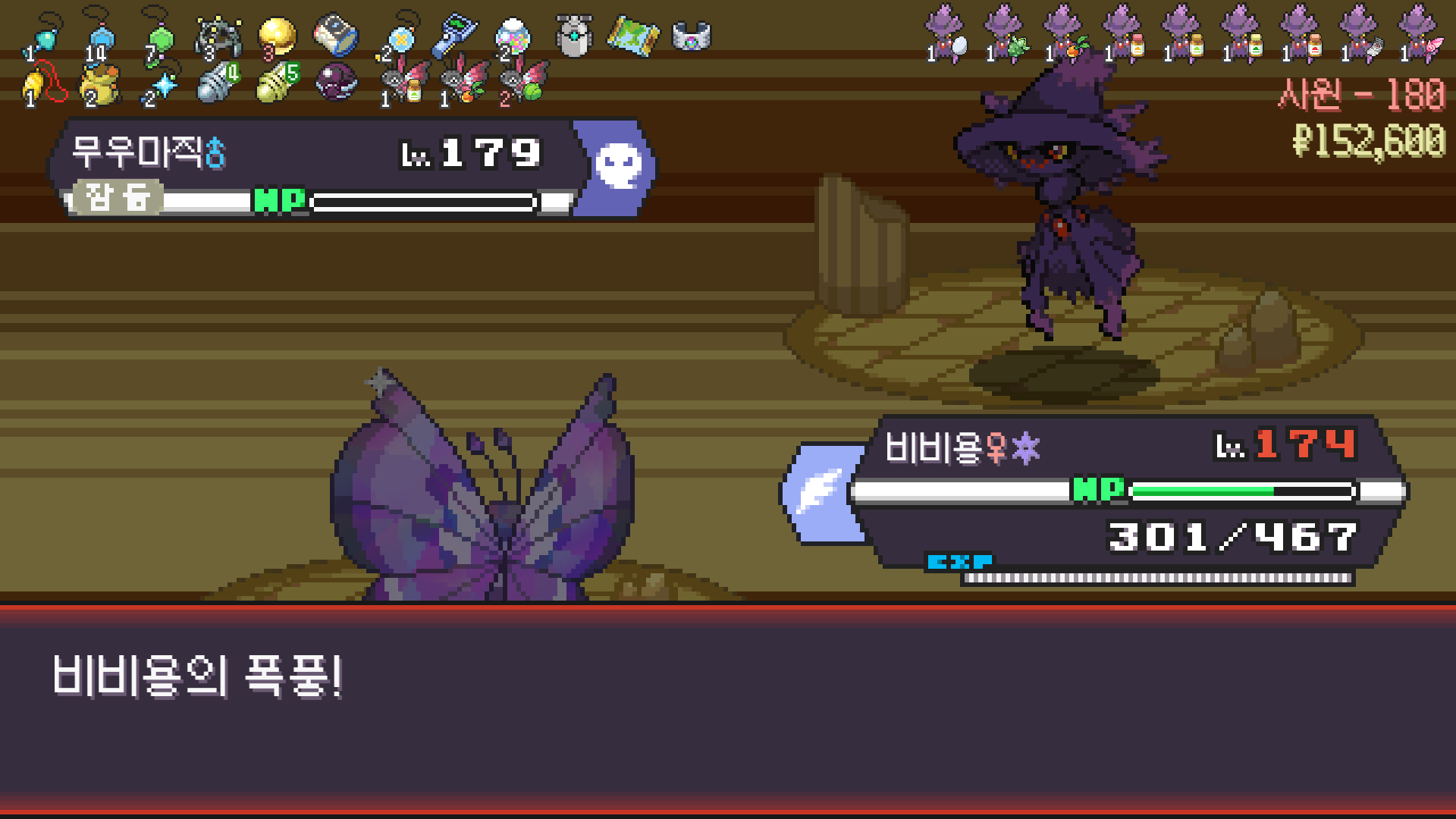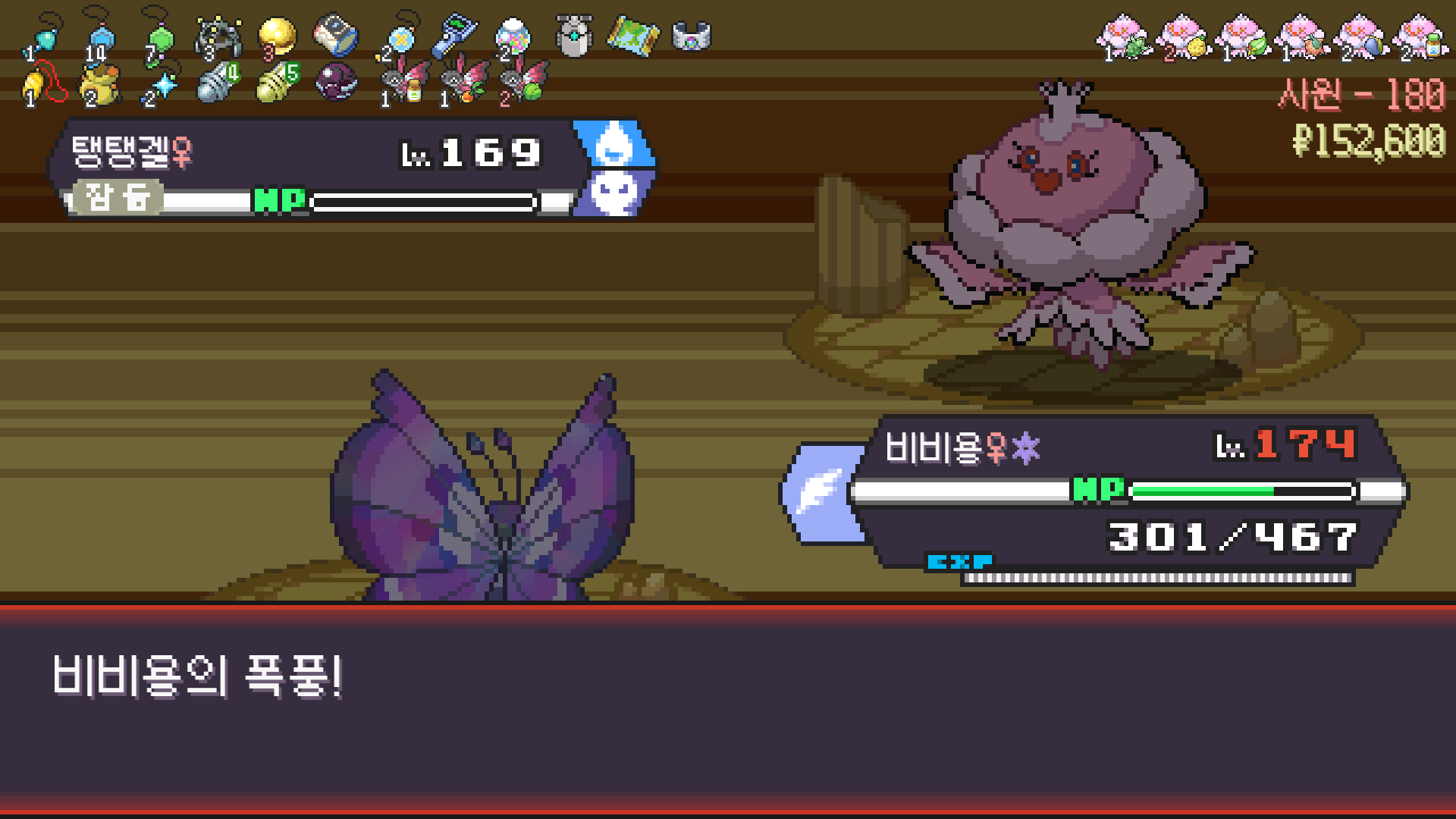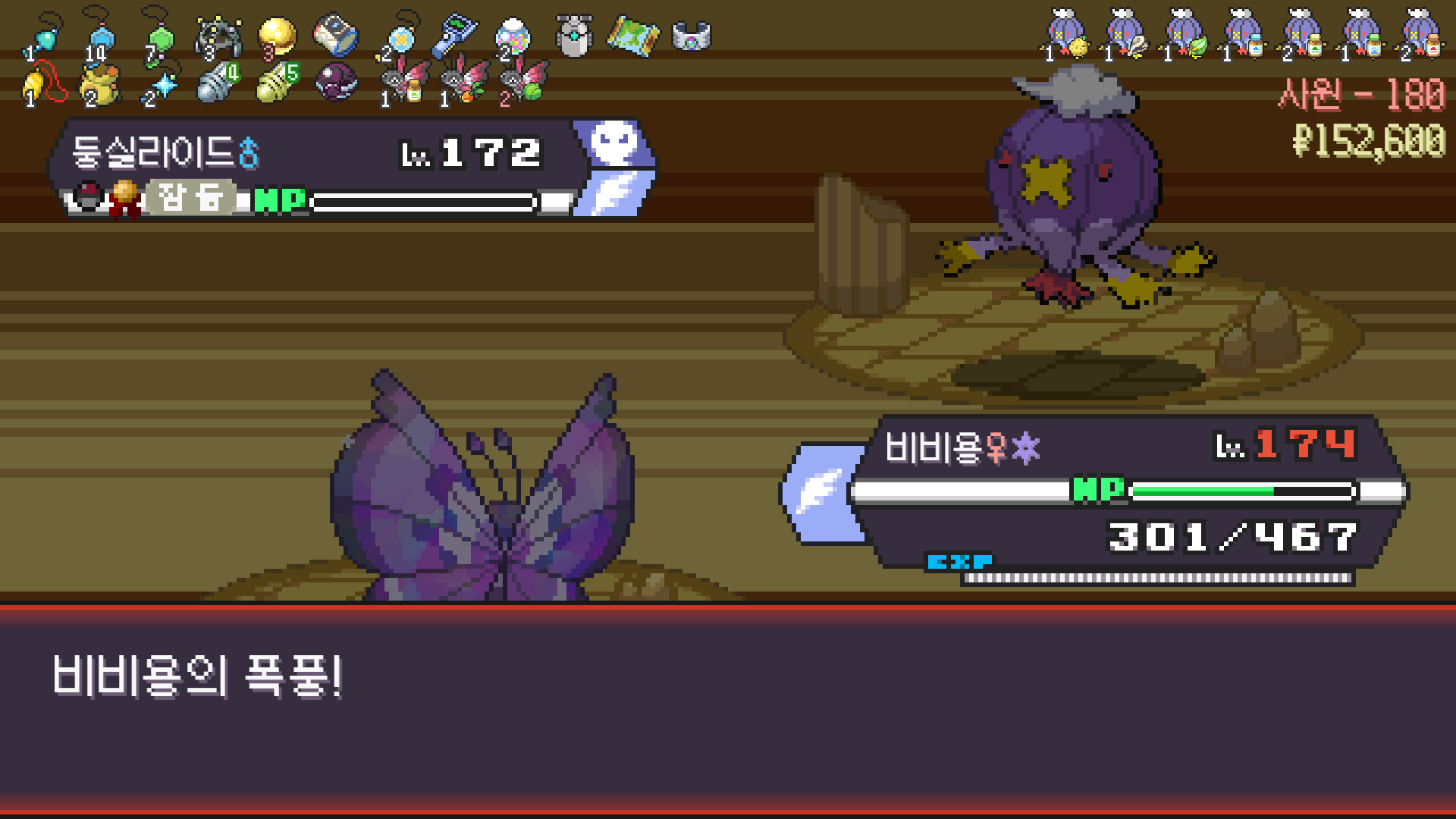 핑크 비비용 : 폭풍/나비춤/벌레의야단법석/수면가루 >> 환상빔/나비춤/빛의장막/엄습하는일격